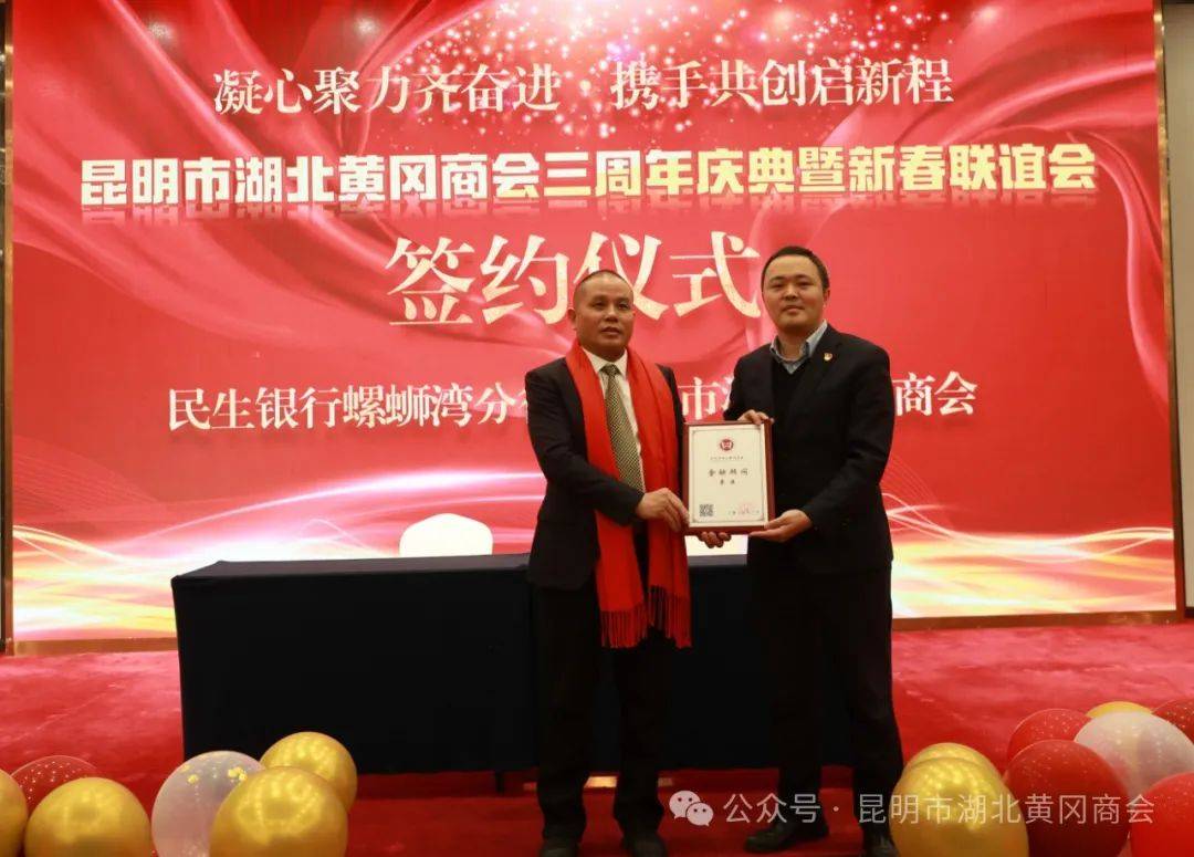 为实现优势资源整合,发挥商会平台作用,更好的服务于广大会员,商会与黄冈国投集团、中国民生银行螺狮湾支行达成战略合作并进行了现场签约,并授予民生银行螺狮湾支行行长萧港为商会“金融顾问”。