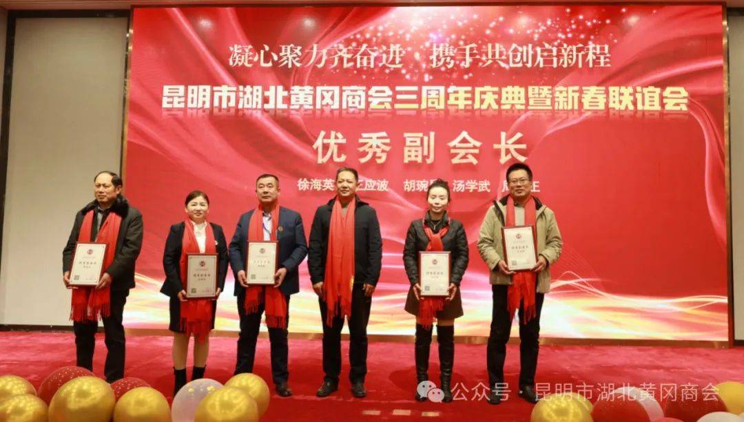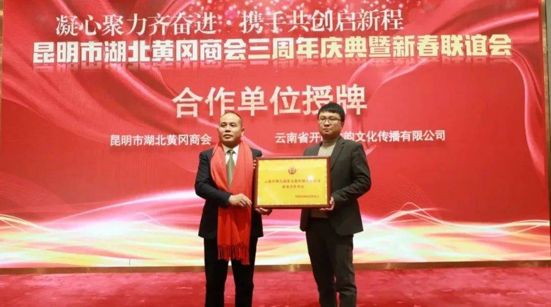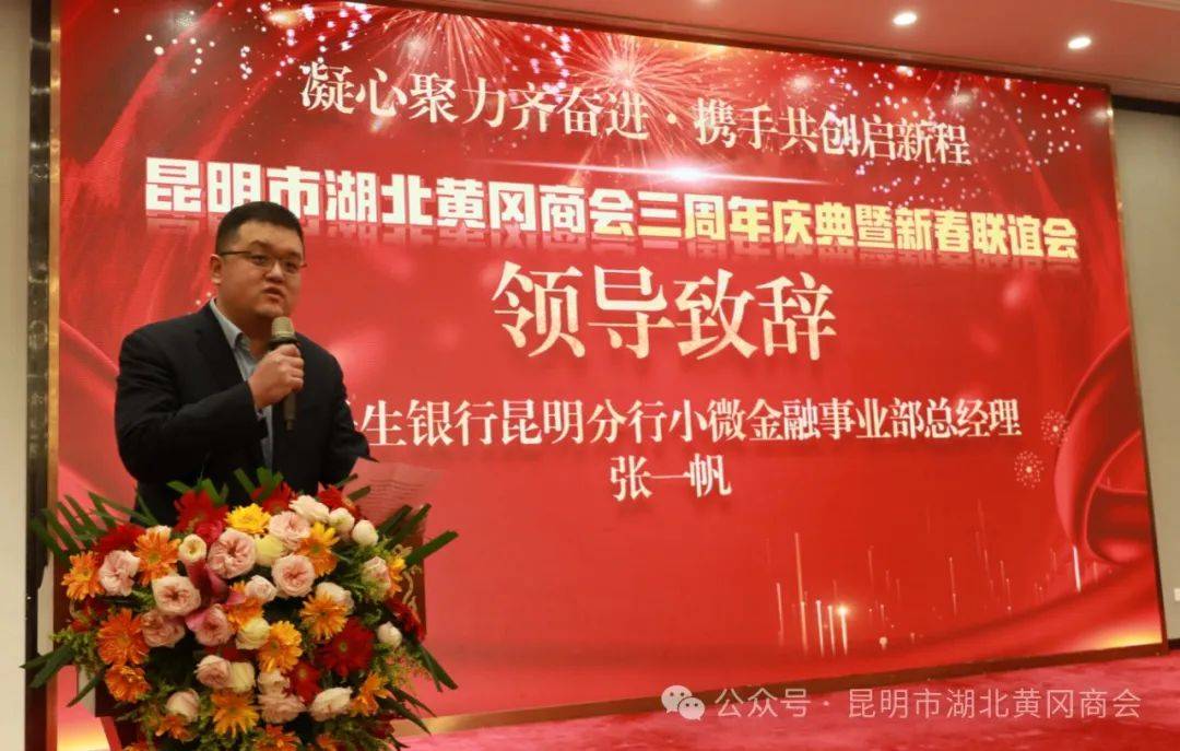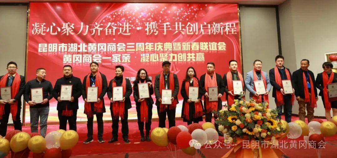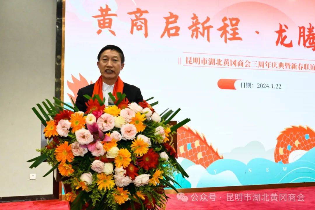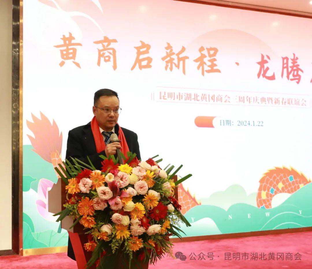云南昆明讯(周松 蔡鲸 范先桃) 龙腾盛世,万象更新。2024年1月22日,凝心聚力齐奋进·携手共创启新程——昆明市湖北黄冈商会三周年庆典暨新春联谊会在西南宾馆隆重召开。云南省工商联党组成员、副主席岳黎松,黄冈市政协党组成员、副主席蔡艮生,昆明市委统战部副部长、市工商联党组书记李富贵,黄冈市委统战部副部长、市工商联党组书记蔡花,昆明市工商联党组成员、副主席肖焱,昆明、黄冈两地统战部、工商联、民政局等单位相关处室领导,黄冈楚商联合会及30多家兄弟友好商协会会长、支部书记、秘书长,及全体会员共400余人参加祝贺本次活动。