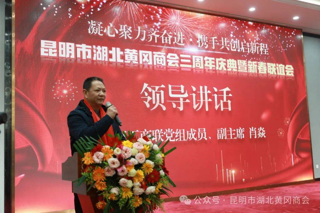 昆明市工商联党组成员、副主席肖焱发表讲话。他表示:受昆明市政协副主席、市工商联主席董林同志的委托,代表昆明市工商联、昆明市总商会向昆明市湖北黄冈商会三周年庆典大会的召开表示热烈的祝贺,对长期关心支持昆明发展的各位领导、各位企业家、各界朋友们表示衷心的感谢!