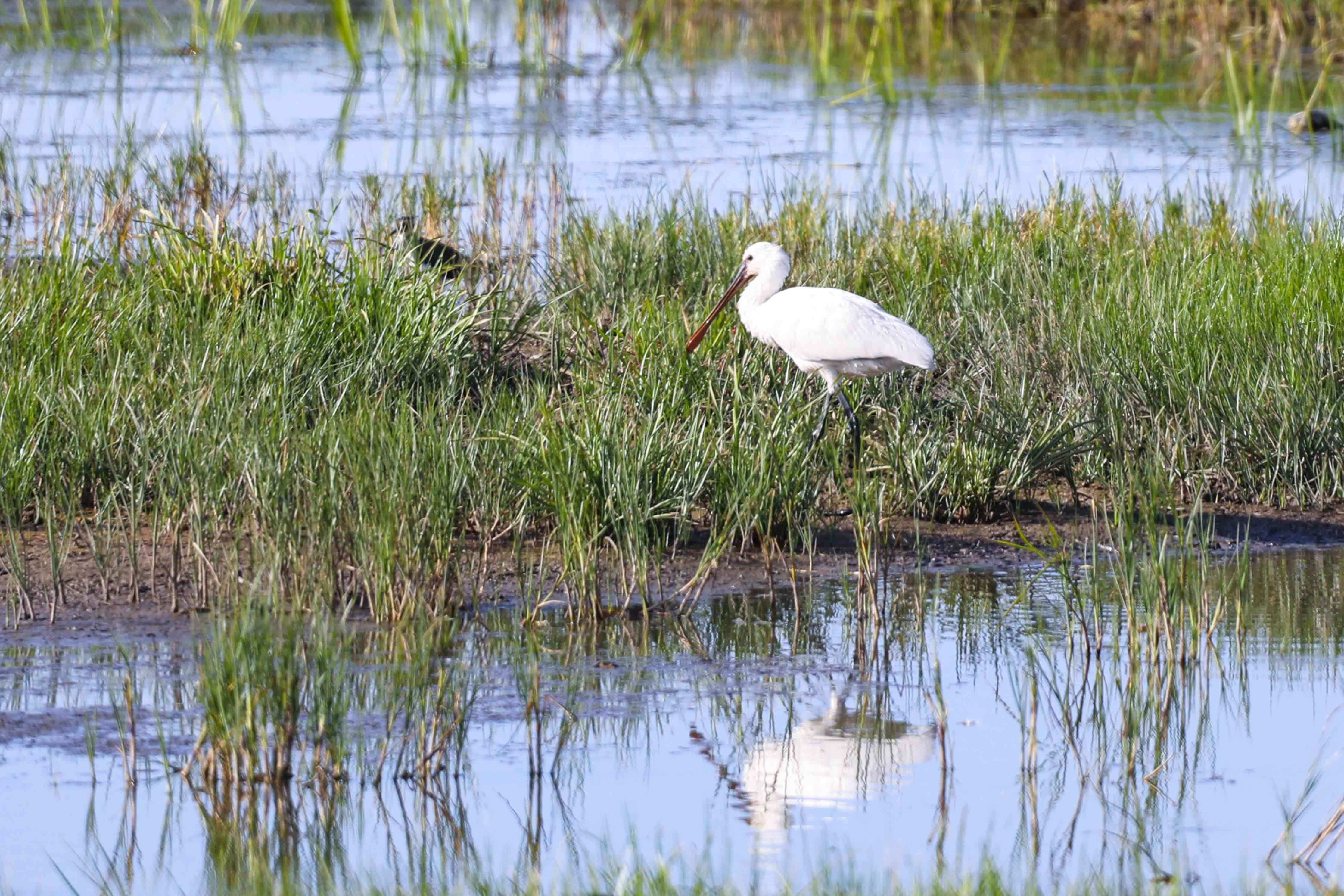 成群的白琵鹭在河北省张家口市塞北管理区水中觅食。王会文 摄