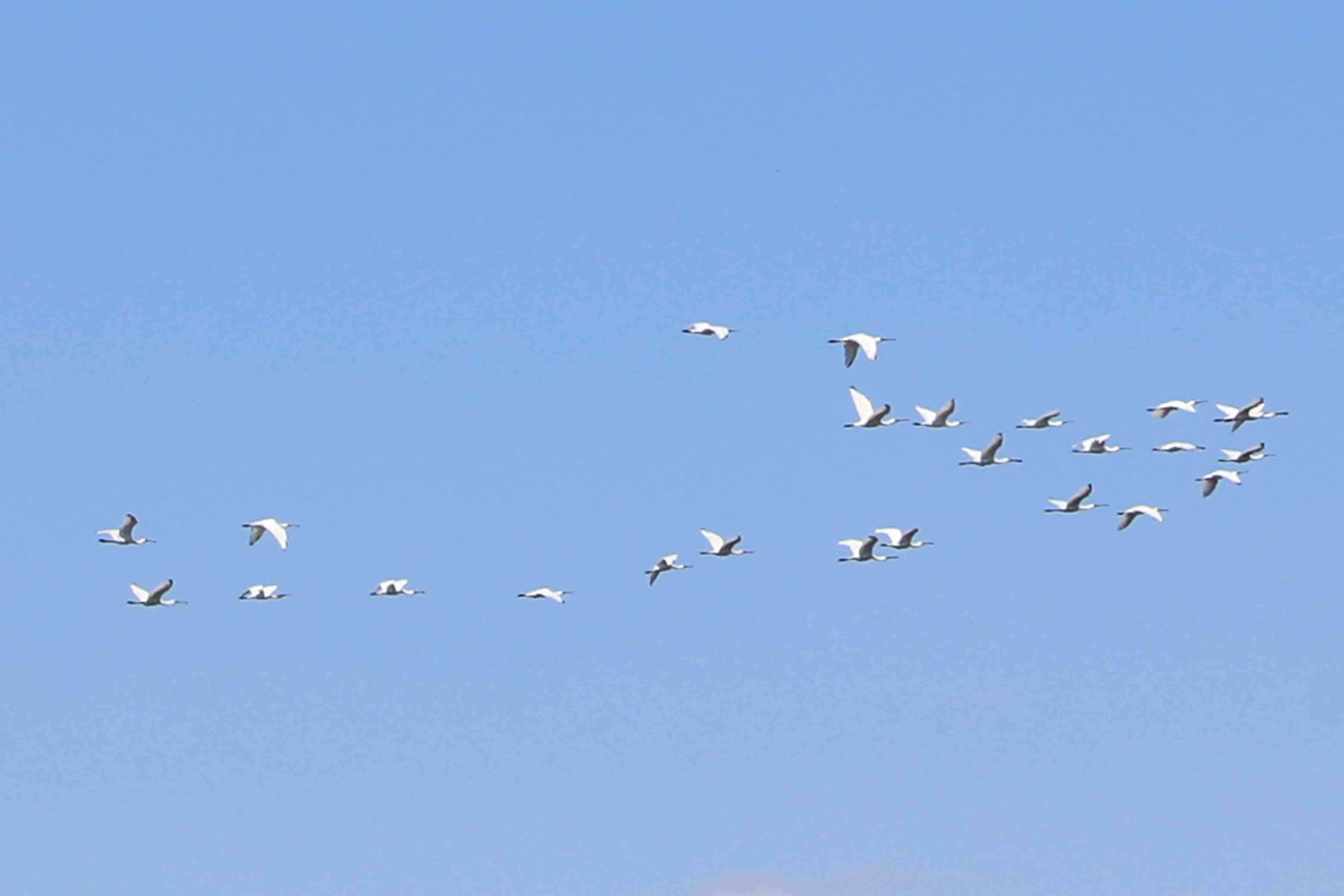 成群的白琵鹭在河北省张家口市塞北管理区展翅翱翔。王会文 摄