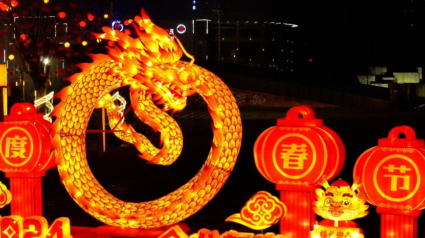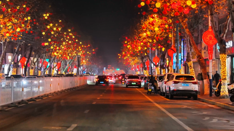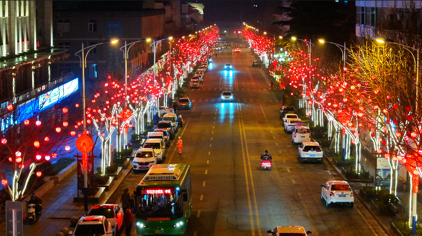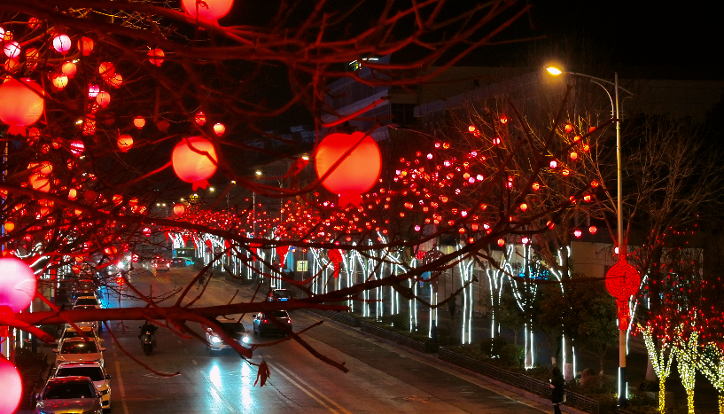 夜幕降临,华灯初上,城区主要街道及广场就像披上了五彩霓裳,流光溢彩,在光影的交汇中,散发着迷人的色彩。红色的中国结、小巧的红灯笼,街道、广场被各式各样的灯饰装点得如诗如画,与新春佳节浓厚的节日喜庆元素相结合,祥和喜庆、欢乐美好的春节氛围感拉满。