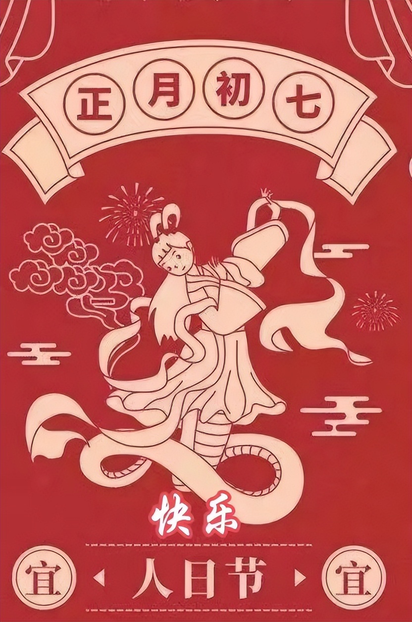 人日,又称人节、人庆节、人口日、人七日等,每年农历正月初七是古老的中国传统节日。传说女娲初创世,在造出了鸡狗猪羊牛马等动物后,于第七天造出了人,所以这一天是人类的生日。汉朝开始有人日节俗,魏晋后开始重视。古代人日有戴“人胜”的习俗,人胜是一种头饰,又叫彩胜,华胜,从晋朝开始有剪彩为花、剪彩为人,或镂金箔为人来贴屏风,也戴在头发上。此外还有登高赋诗的习俗。唐代之后,更重视这个节日。每至人日,皇帝赐群臣彩缕人胜,又登高大宴群臣。如果正月初七天气晴朗,则主一年人口平安,出入顺利。