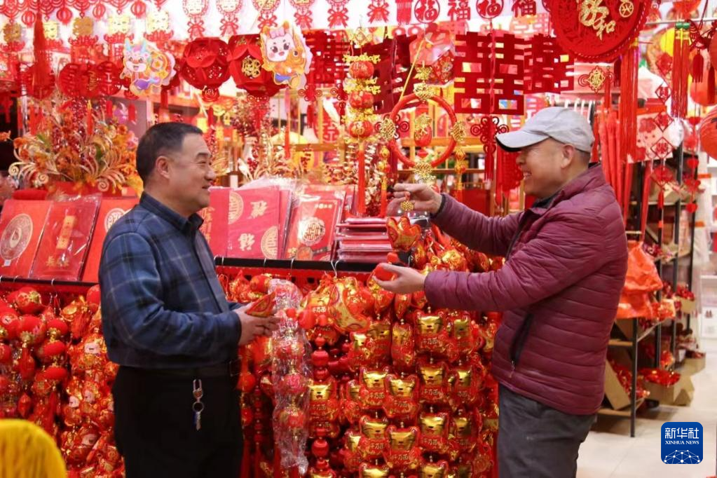 “进来挑一挑,路过选一选哦。”在河北省石家庄市南三条市场的中江文化城,苏青刚站在摊位前卖力吆喝,店铺内外灯笼、对联、窗花以及以龙为图案的玩具和摆件等商品琳琅满目。
