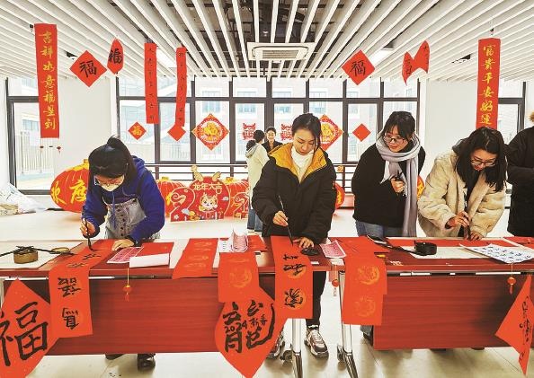上海海洋大学的留校学生写春联和福字,迎接农历春节的到来。陶磊 摄