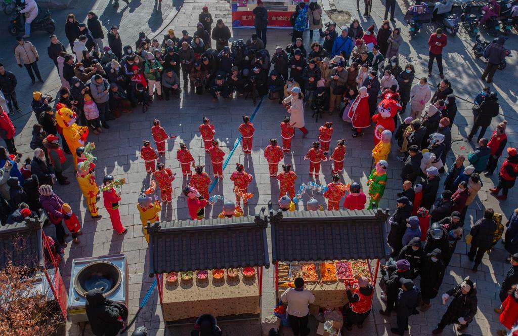 正月的“民俗大庙会”上,贯穿全天的民俗演艺轮番上演,游人在古城边逛边看。游客高明宇带着孩子游览古城,感受过年氛围。“我们观看了踩高跷、舞龙舞狮等民俗杂技表演,和铜人雕塑合影拍照,特别开心,孩子感觉很新奇。”