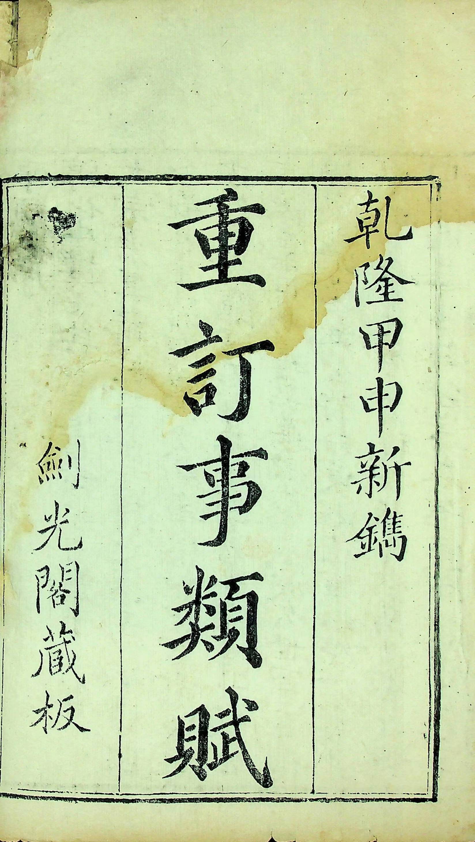 张家口市图书馆馆藏的《重订事类赋》系乾隆二十九年(1764年)的剑光阁版,是对明“华麟祥本”校刊后定名的版本,全书共30卷,该书不同于后世增订或重刻的40卷本,较为珍贵。