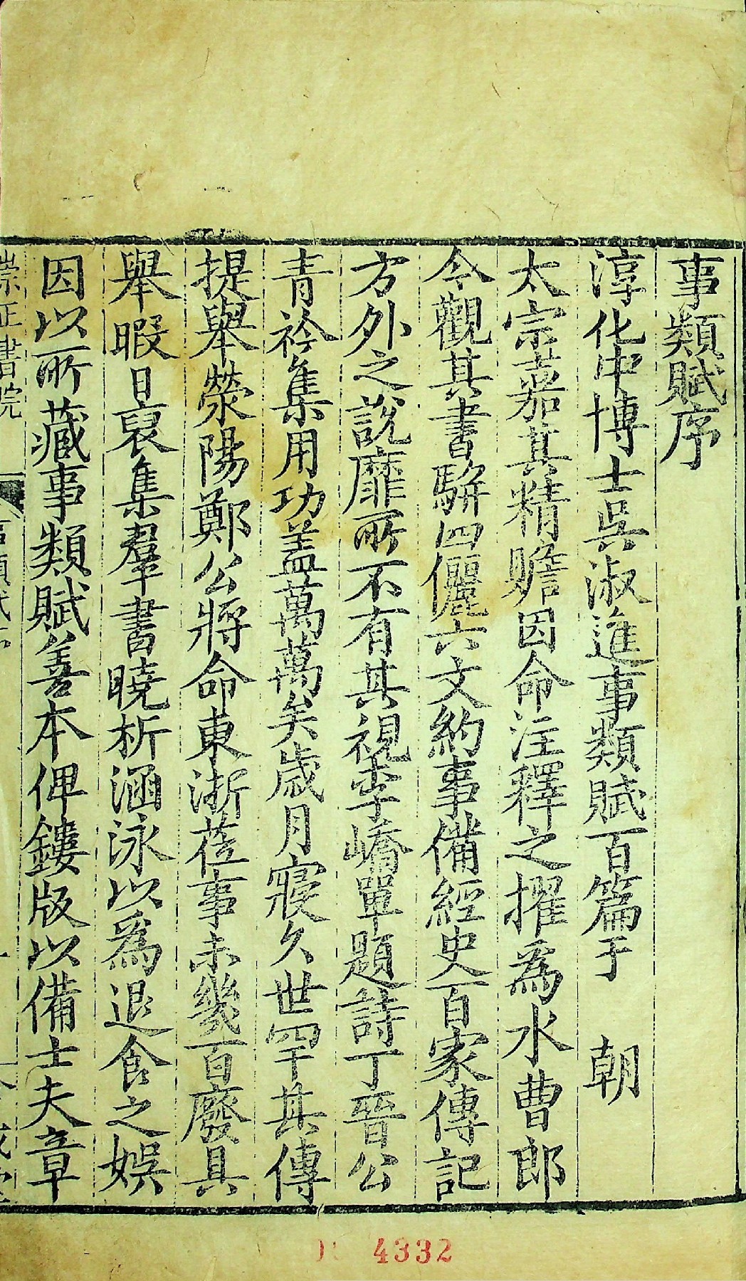 《事类赋》原名《一字题赋》,是以赋体形式编辑的一部综合性古代类书。作者吴淑(947年—1002年),北宋文献学家,字正仪,润州丹阳(今江苏丹阳)人。南唐时,吴淑官至校书郎兼内史。归宋后,荐试学士院,授大理评事,后官至起居舍人,职方员外郎。吴淑还善书法,尤以篆籀见长。著有《说文字义》《江淮异人录》《秘阁闲谈》等文集10卷。