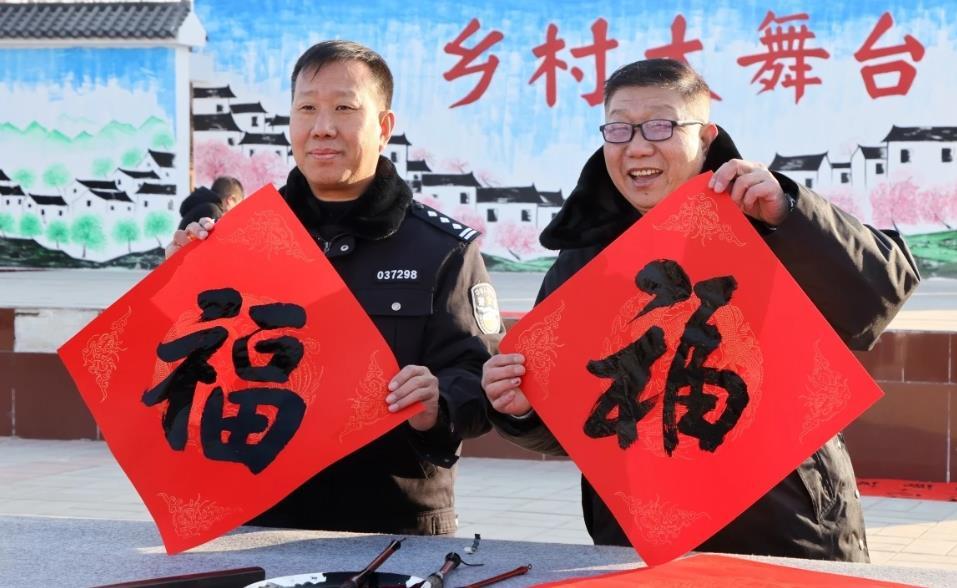 当日,在万全庄村的小广场上,笔墨纸砚一字摆开,来自保定公安机关的警营书法家和涿州本地的书法家们挥毫泼墨,一张张饱含守护深情的大红福字,写满了公安民警对村民的祝愿。