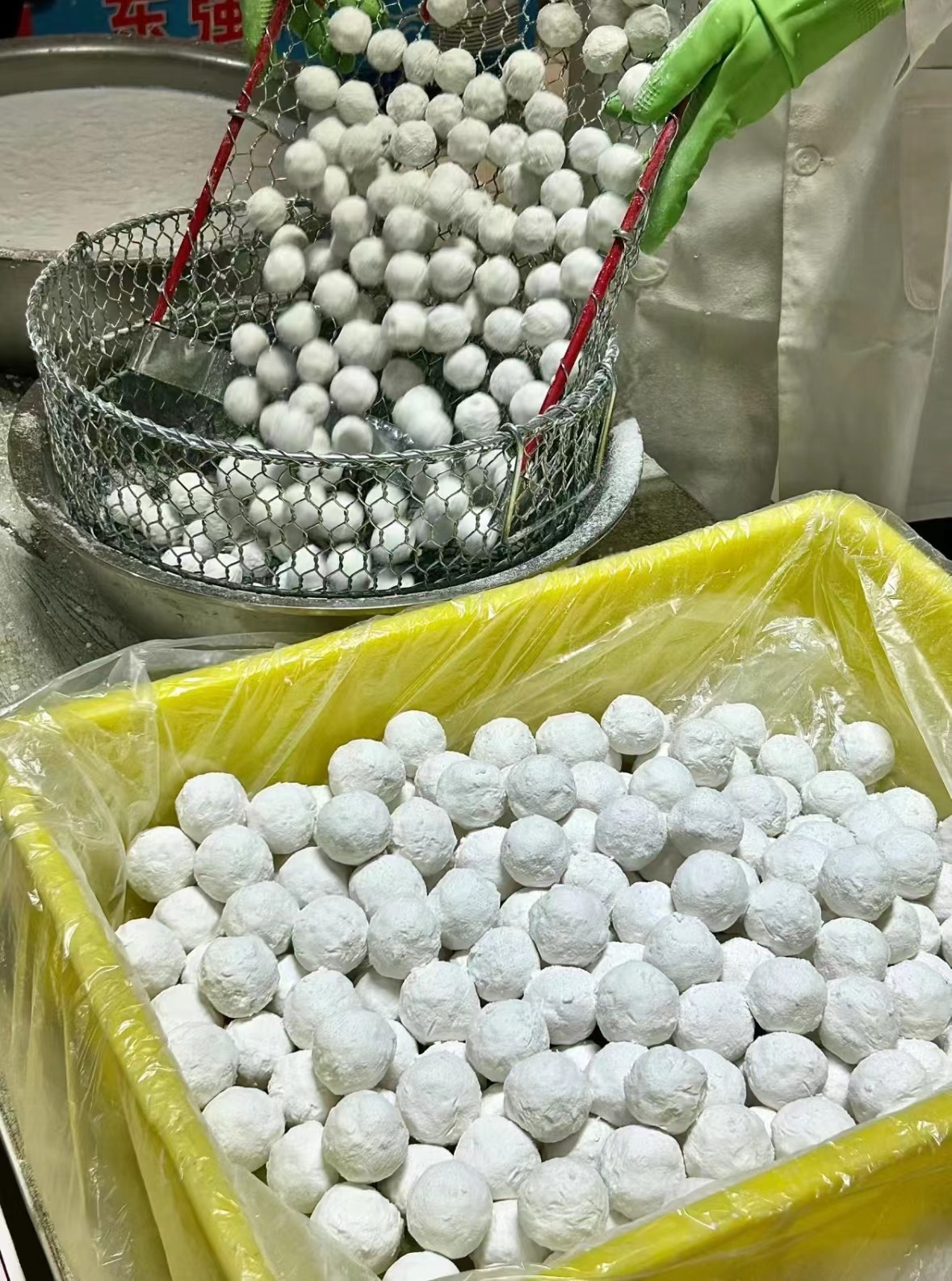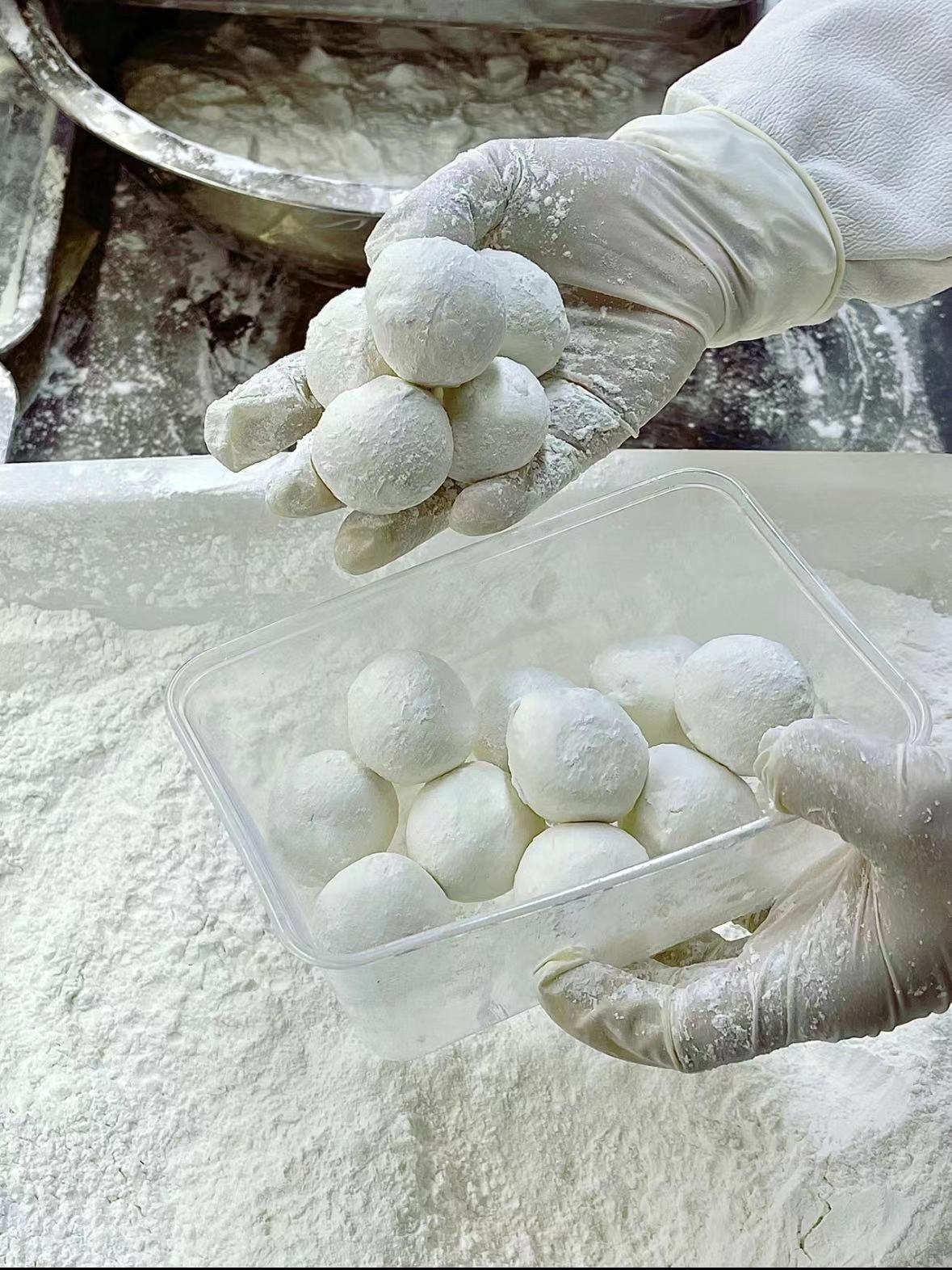 将制好的馅料蘸少许水,放到糯米粉里不停地翻滚,滚一道,过一道水,再滚一道,再过一道水,经过四蘸四滚后,制作出来的元宵既瓷实又有弹性,无论煮或炸,都软糯香甜、口感独特。虽然工序复杂,但这是古镇人记忆中的老味道。