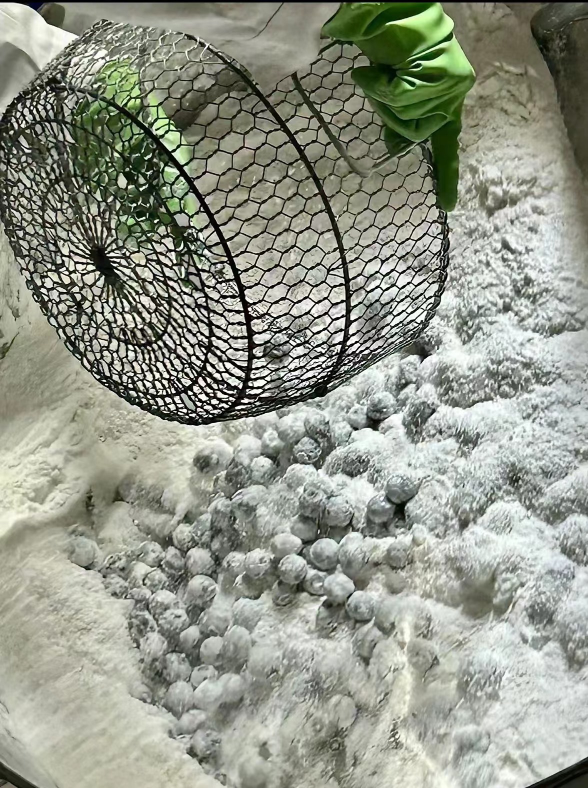 将馅料倒入糯米粉里反复翻滚。