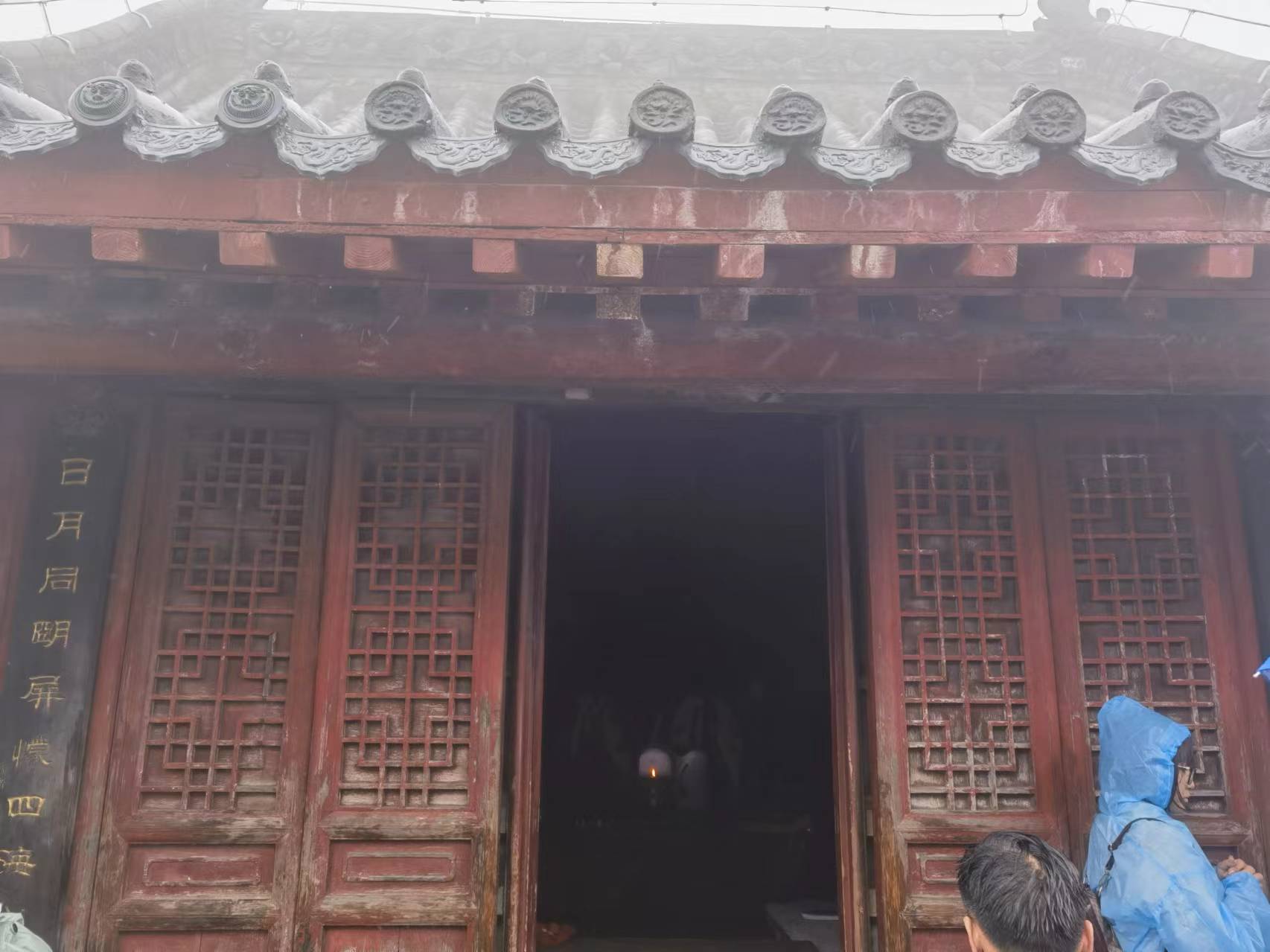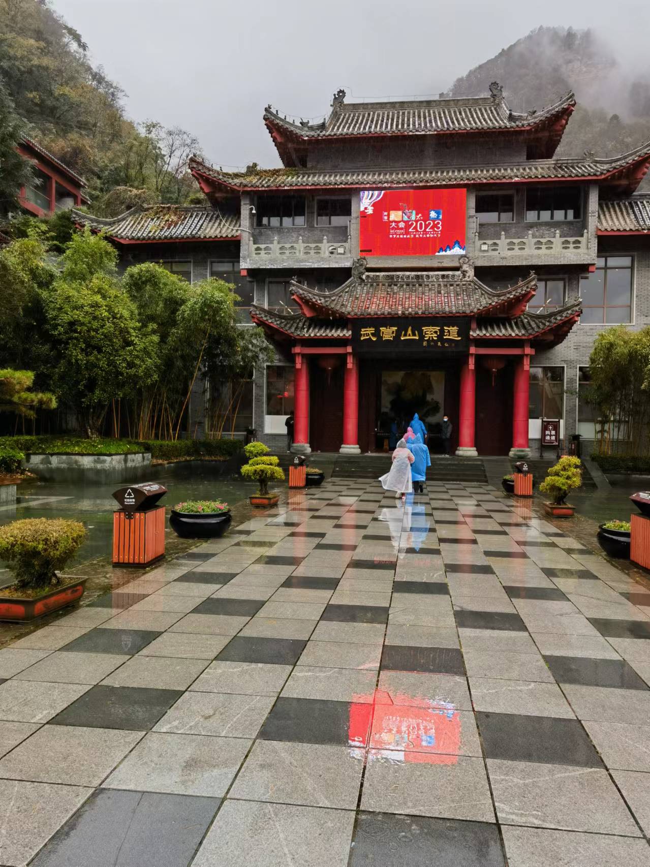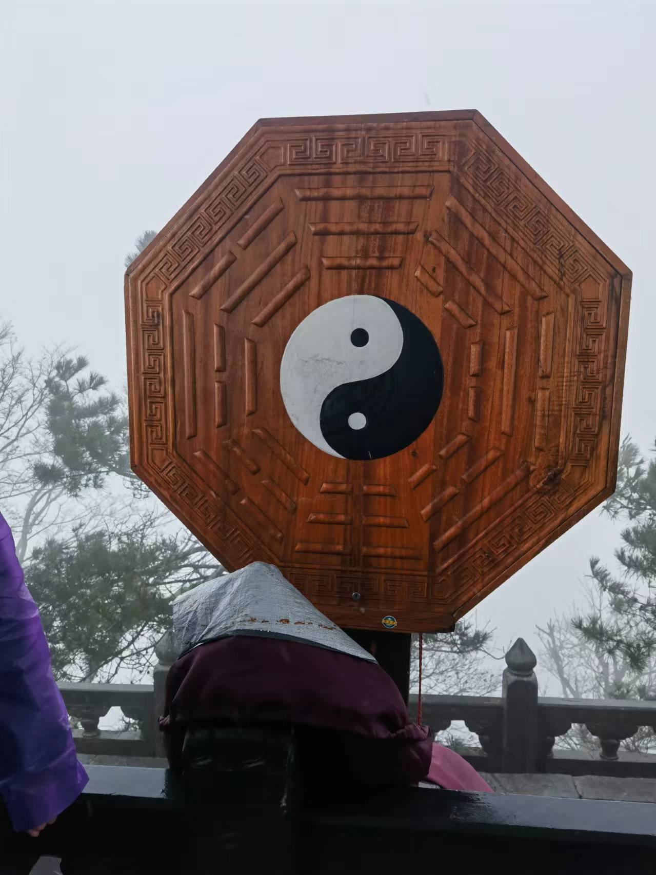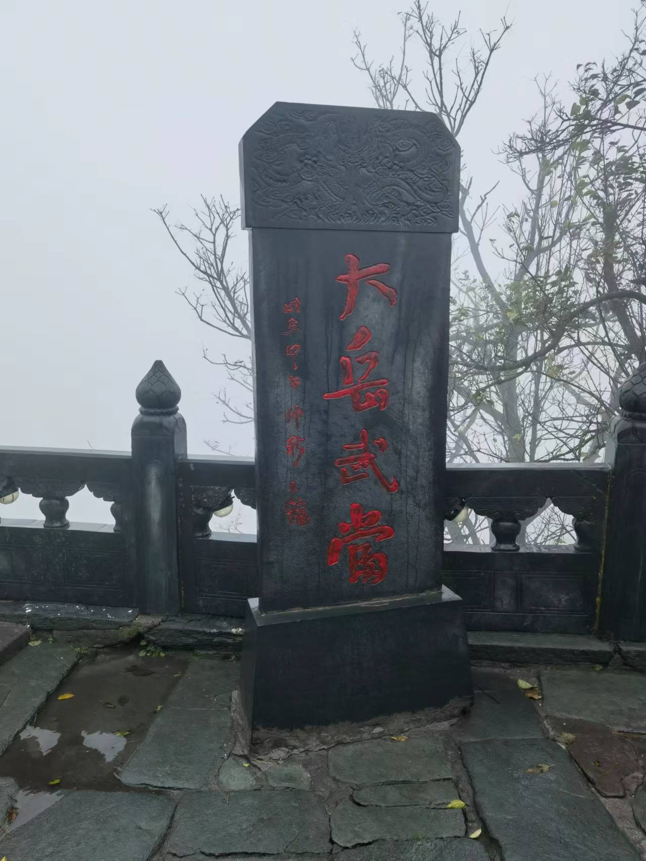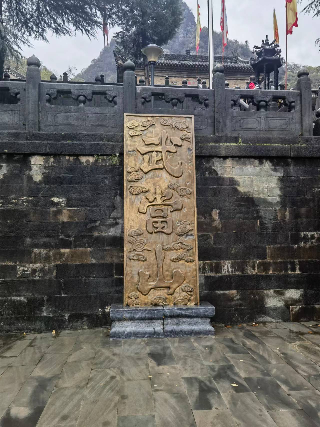 2023年11月5日早餐后我们即驱车去武当山,到了山下,天下起了小雨,我们买了雨衣和拐杖,乘地方统一的大巴车驶上登山公路。小雨与薄雾融合在一起,装扮的武当山更加婀娜多姿,车子越过一座山峰又接着一座山峰,如同行驶在仙山琼境之间,半个多小时后又换乘了缆车,向更高的山峰驶去,在缆车上鸟瞰山谷如临万丈深渊,令人头晕目眩;向前望去,面前的山峰似刀削斧修,参差盛茂的山松和岚烟细雨,活脱脱的就像一幅巨大的山水画挂在眼前。缆车行驶了二十多分钟到达了终点,但离山顶还有200多米的高程,需要一个台阶一个台阶地向上攀登。此时雨还下着,伴着凛冽的山风,已是十分寒冷了,我们都穿上雨衣,套上塑料雨鞋,拄着拐杖,一步一步向上艰难爬行,有的台阶特别陡峭,爬二十阶就要休息一会,有时甚至要手脚并用,心脏、脉搏都跳到了极点,但依然还是向上攀爬。用了一个多小时的时间,终于登上了天柱峰,走进了太和宫,接着又爬了一段,最终上到了金顶,看到了金殿。金殿矗立在三面绝壁的险峰上,是永乐年间修建的。殿顶金光闪闪,殿内供奉着真武祖师像,这时方算真正登上了海拔1612米的武当山。站在金顶极目远眺,只见浮云飘渺,山风拂面,如同到了天边一般。不禁有了《雨日登武当金顶》的诗: