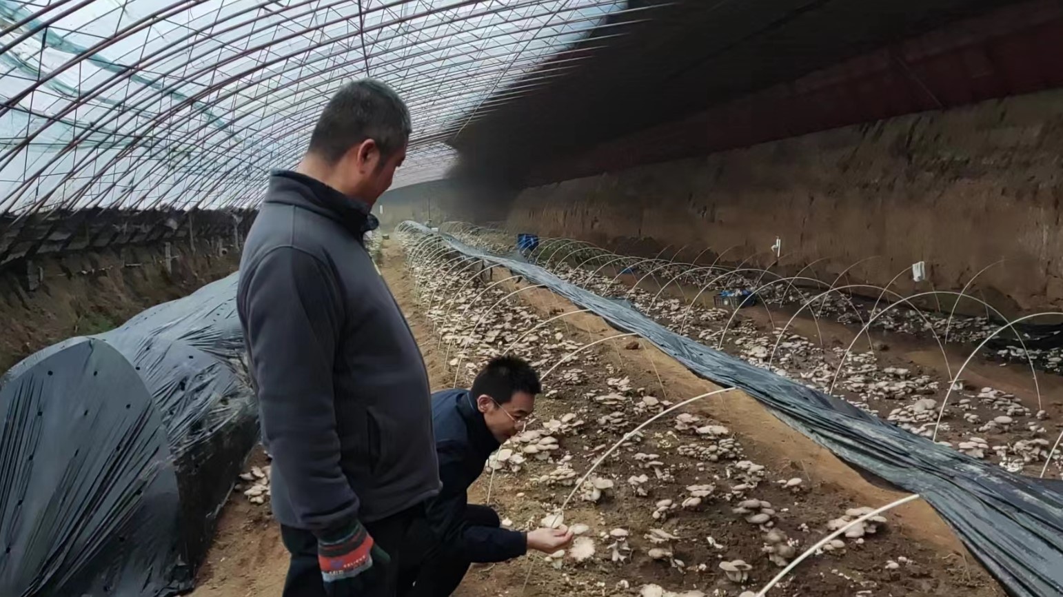 技术人员查看蘑菇和叶菜的生长状况,向农户讲解雪后注意事项。涞水县农业农村局供图