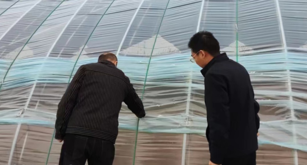 技术人员查看农作物生长状况,现场指导农户采取有效措施应对寒潮及降雪天气,提醒农户及时关注灾害性天气预警信息。同时,重点排查各类设施大棚安全隐患,提醒农户及早做好加固设施、增加覆膜、除雪等工作,确保果蔬稳健生长,为农业生产的正常进行提供保障。