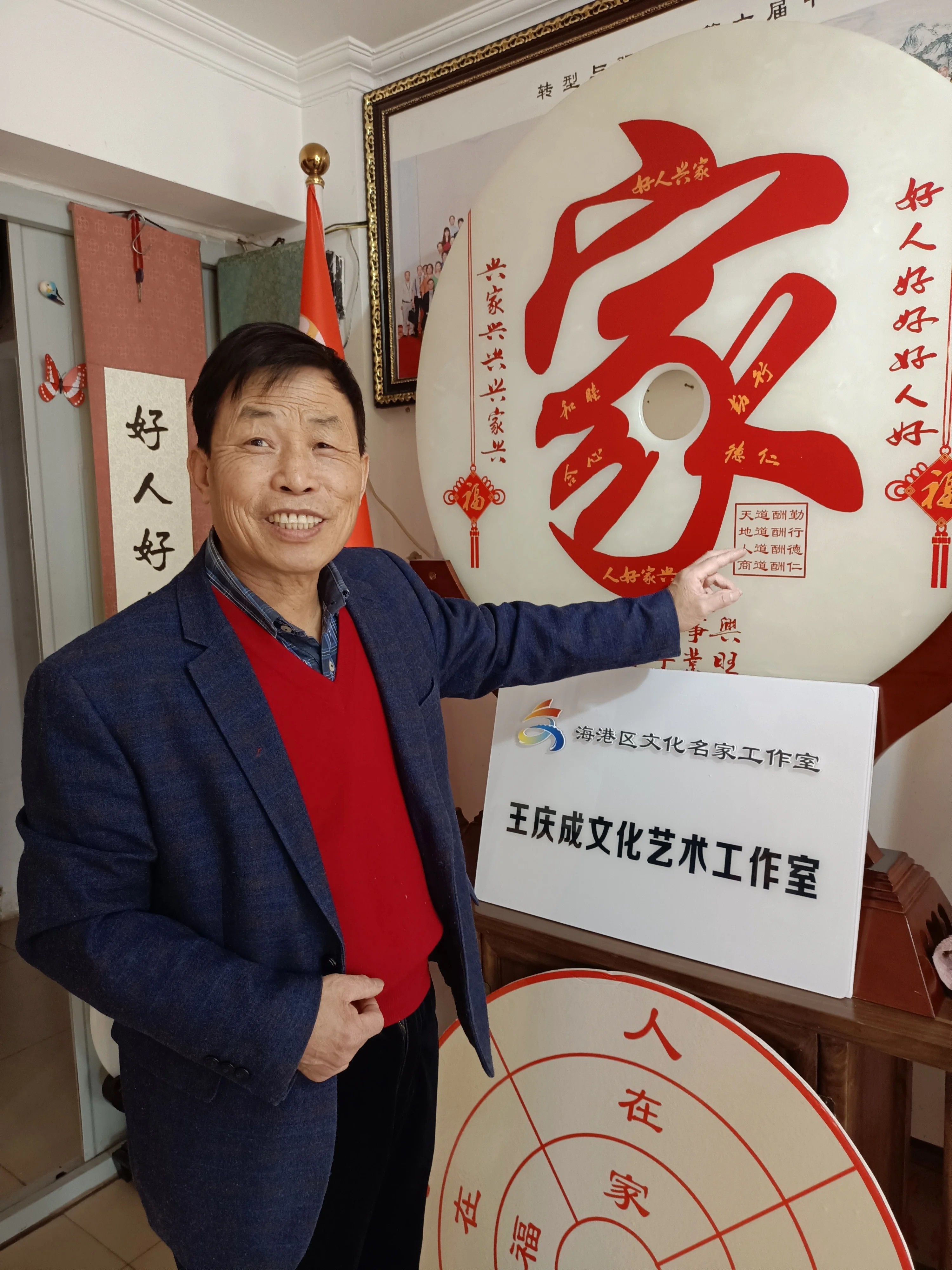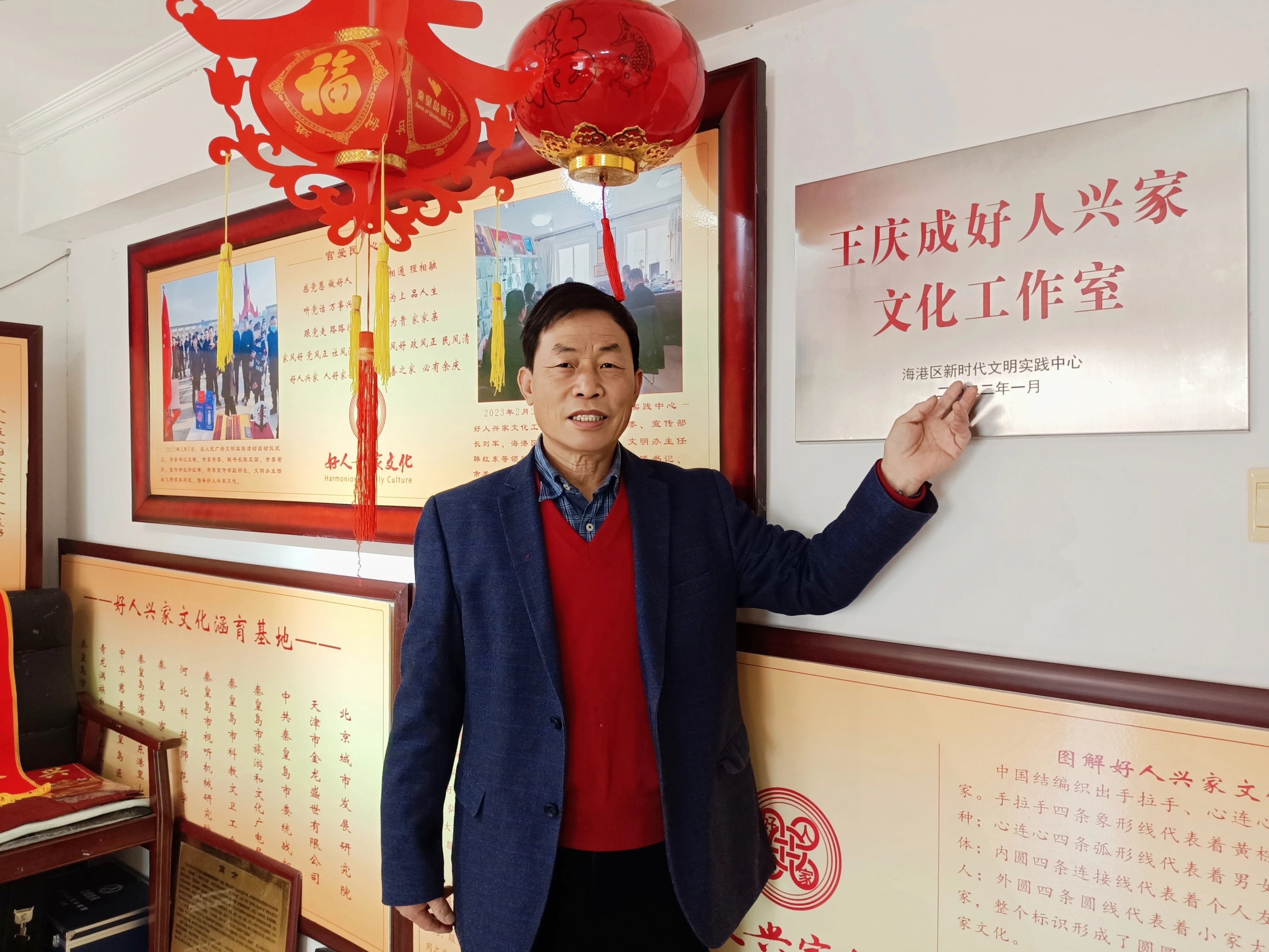 热衷于传统文化的王庆成是一名退役军人,2007年,从金融系统退休的他开始研究与传统文化相关的文创作品,如今,他创立的“好人兴家文化”工作室被列入海港区新时代文明实践基地,本人也被驻秦高校等多家单位聘请为文化讲师。