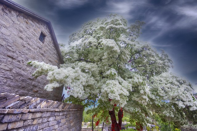 流苏树又被誉为最典雅、最富浪漫情怀的植物。相传齐桓公就在淄博“峨庄”栽下了被称为“千年齐鲁树王”的流苏树。有道是“树覆一寸雪,香飘十里村”便是这般情景。此时,流苏花间仿佛隐现出一翩若惊鸿的美女,用她那姣美的纤手携一众仙女;一束束、一簇簇似雪如雲般,伴徐来微风漫舞轻摇。沁人心脾的清香,弥漫在这清幽的山村和田野间,恍若人间仙境,迷醉了整个春夏。