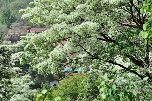 据传每年五月,当地都会有一场属于初夏的“雪景”,这便是形容流苏花盛开的影象:洁白的流苏花开满树冠,层层簇簇、花香四溢。游人在高大的千年古树下,抬眼望花团间如冰凌般清透,弄不清是天上花、还是花变天?站立在山坡或高处远观树冠,又宛若白雲似的轻柔,而繁茂的花、叶遮挡的本来多姿的树干和枝条,却显的躲躲闪闪,少见了踪影。可见这流苏花的雍容华贵、花团锦簇、光采耀目是名不虚传的了。难怪古人以此而设计制做出“流苏”,做为女性着装的精美饰物,隨婀娜的步履而轻摇颤动。又会在闺房中的帐帏间,做为挂件而装点居室,尽显流苏之美。所以,处在这壮丽的景观中,自然会使人心旷神怡并感知心灵的震撼。