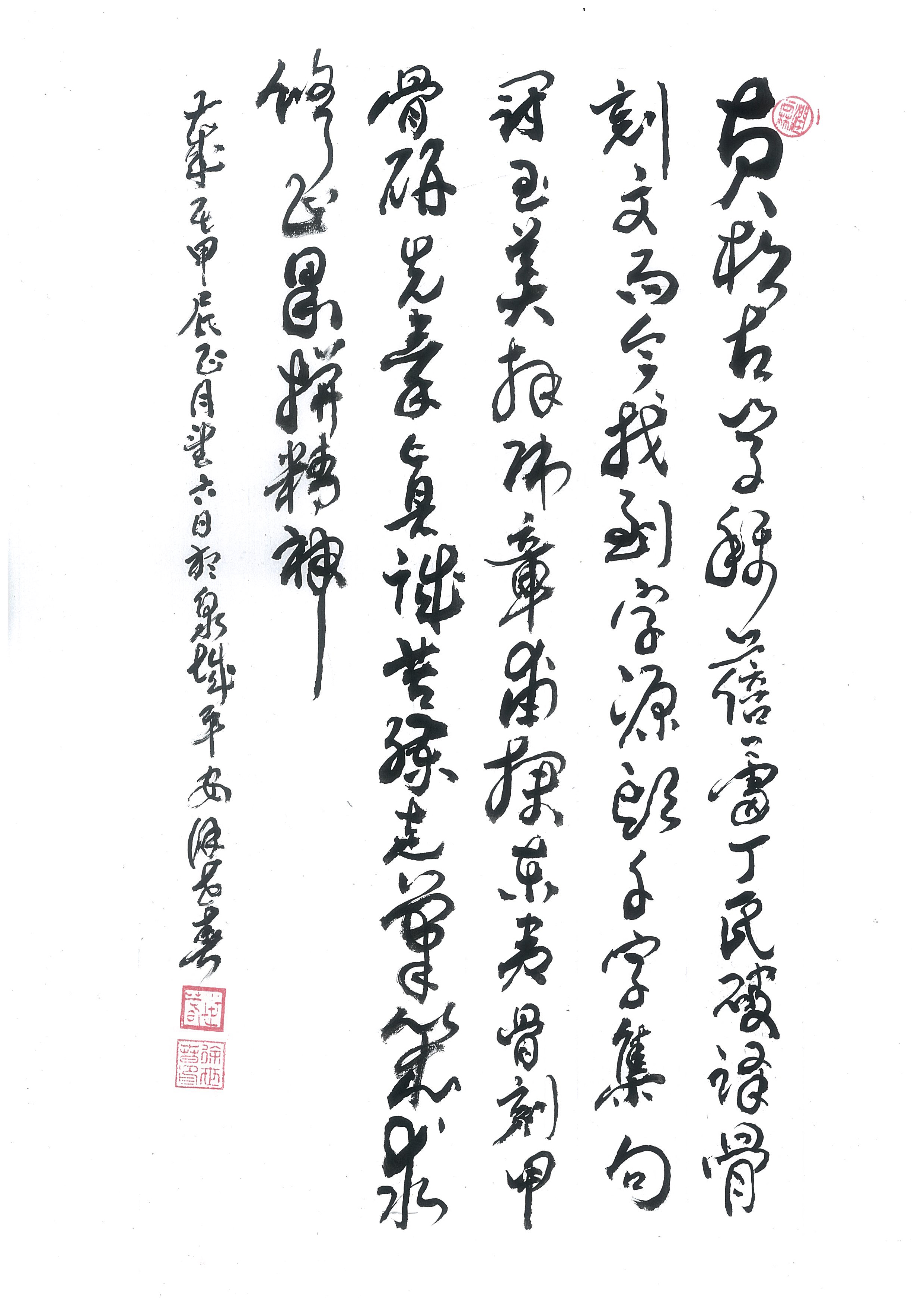 说起东夷骨刻文,徐老师道出与丁再献院长结下深厚友谊的故事,记得那是在2009年《大众日报》发表了丁再献院长关于骨刻文的文章,得知东夷骨刻文要比甲骨文早1300多年,喜出望外。于是,他便慕名找到了这位资深东夷文化学者丁再献院长,他可爱可亲的样子至今记忆犹新,分别时丁院长还热情的赠送了他出版的宝书与书法艺术作品,至今收藏于柜时常翻阅取经,自此,拜他为师成了知己,经常微信来往于东夷文化及骨刻文研究的海洋里,也因至今丁院长系统破译的骨刻文不到千字,所以给集句集联和集诗都带来了一定的难度,为此徐老师也只能用骨刻文和甲骨文双骨文撰诗了。