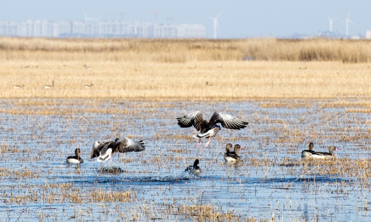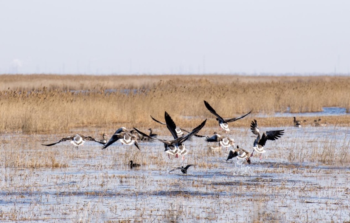 在湿地中栖息、飞翔的灰雁。沈新生 摄