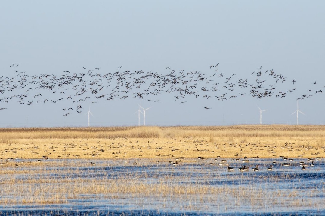 在南大港湿地,成群的灰雁在飞翔、栖息。沈新生 摄
