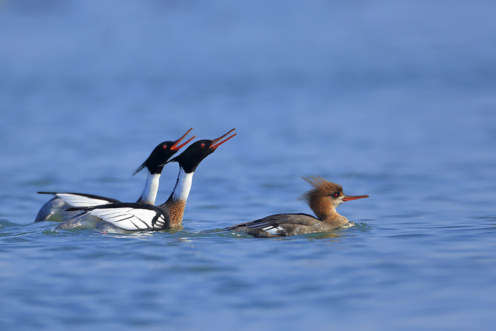 红胸秋沙鸭飞行快而直,起飞时两翅在水面上急速拍打一阵才能飞起,显得有些吃力而笨拙,但起飞后速度极快,是世界上以飞行速度见称的鸟种之一。
