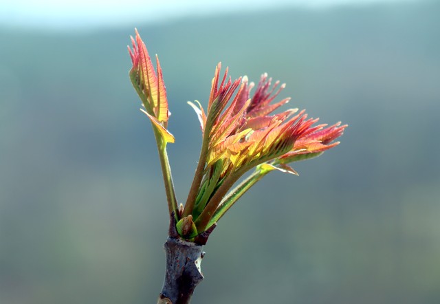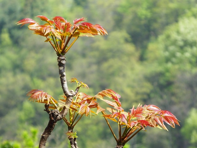 过了大约三周多的时间,我发现香椿树顶端真的发芽了,红色的,我喜出望外,对母亲说:“妈妈,香椿树活了!发芽了!”母亲听后说:“今年吃不上!要吃也得明年,今年掰了的话,会把树‘气’死!”听了母亲的话,我有点沮丧!过了段时间,等到香椿芽长到三、四厘米长时,我偷偷地揪了一个小叶,叶是酱红色的,很漂亮,我把它放到鼻子上一闻,香味浓郁,真的太香了!
