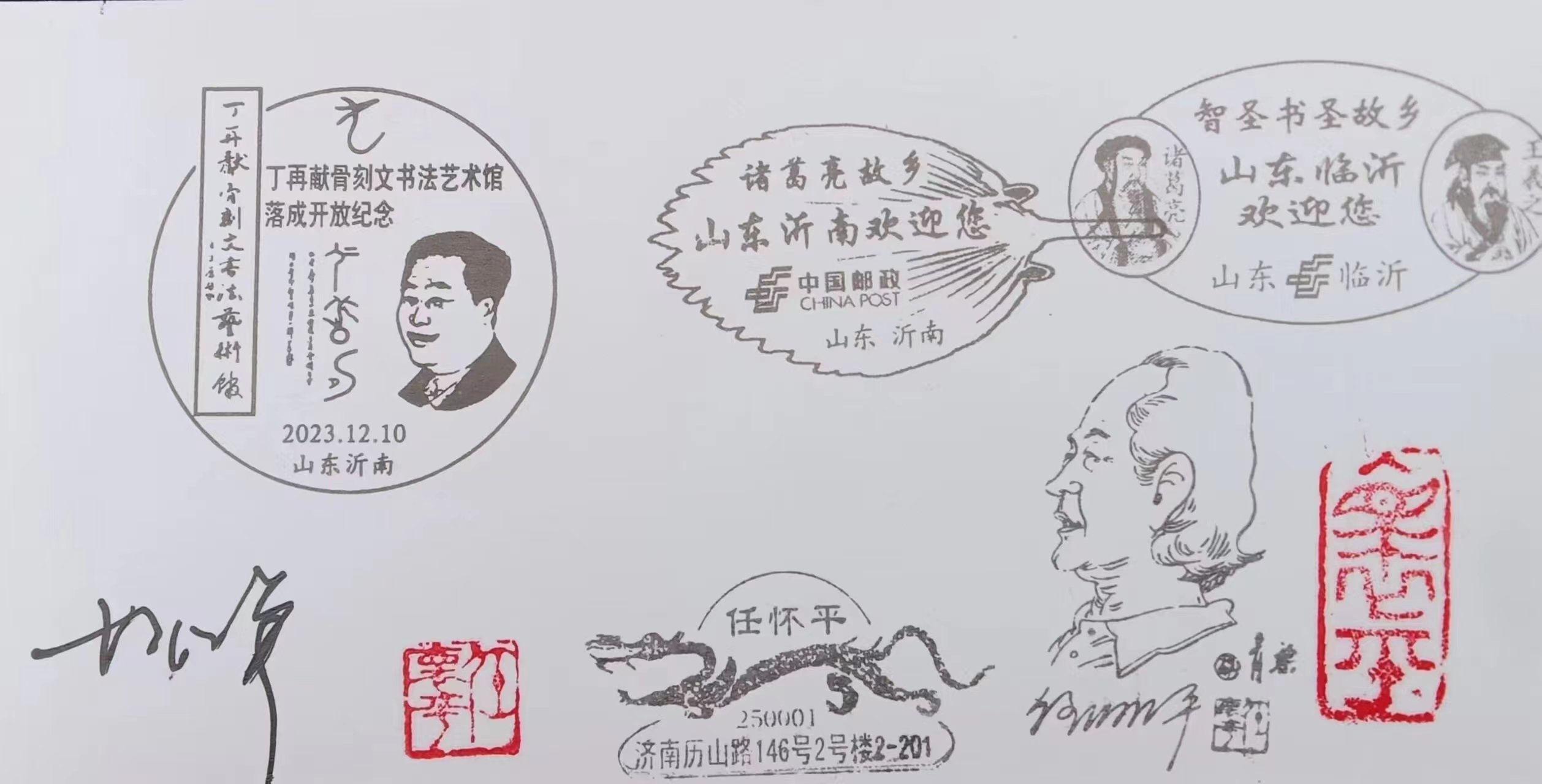 纪念封、纪念戳等邮品制作成为一种国际通用的通信媒介,具有广泛的传播力和影响力。近年来,著名邮品设计艺术家任怀平大师做了积极的探索,先后设计了丁再献骨刻文“济南泉水文化”纪念封和纪念戳、丁再献骨刻文书法艺术馆纪念封和纪念戳、甲辰龙年和藏历龙年纪念戳等,将丁再献先生破译的骨刻文设计在邮品系列其中,不仅是对这一古老文字的一种创新性传承,更是对中华文化的一次全球化推广。他的这些举措,不仅提高了骨刻文的知名度,也为其传承和发展奠定了坚实的基础。