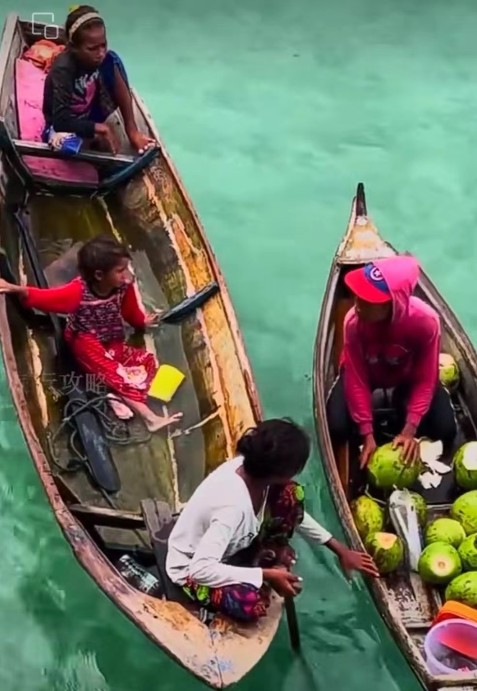 几座架在空中的木制棚屋,破旧的水屋,空荡荡的木柱上晾着各色衣物。海面上,穿梭着一艘艘捕鱼的小船。巴瑶人是潜泳的高手,能潜到30米甚至更深的海域捕深海鱼,寻找珍珠以及海参,他们去陆地换取大米、水和其它物品。我看到船上妇女和儿童向游人兜售鱼虾和椰子。导游了孙小姐盯看着一盆半尺多长,活蹦乱跳的海虾与20余只肥大海蟹 ,她与船上那个女人说了一通我所听不懂的话,就买下虾蟹。她悄悄地对大家说:“巴瑶人不会做买卖,让买者自行出价,没有斤两 计较,价格合意,又或心情不错,立马交易,直接随性。”我和家人另外船上买了两个椰子,付了10林吉特 ,让卖椰子的小男孩送到木板搭成的栈桥上,他比划着还要加费。