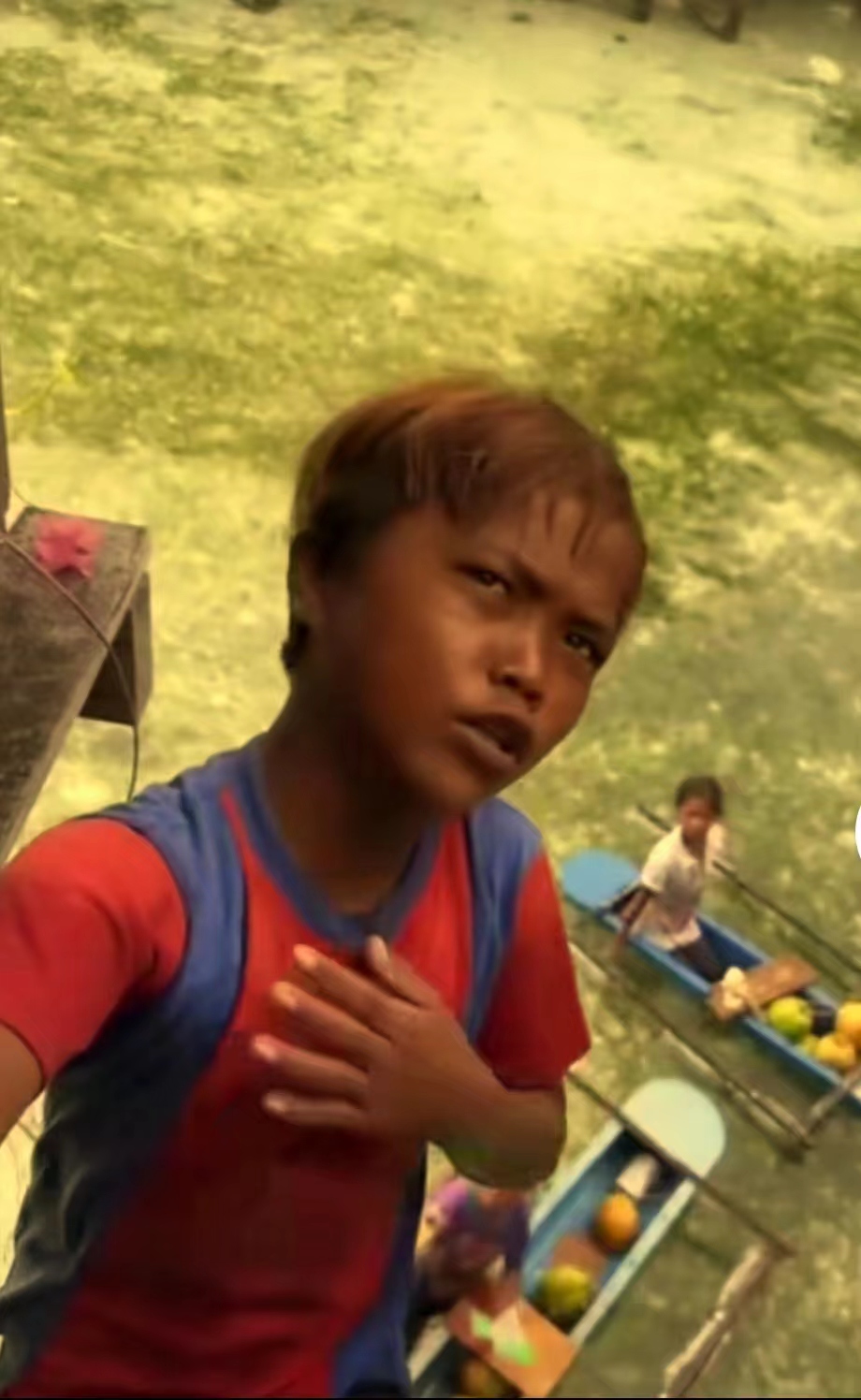 继续前行有处学校,西去不大的运动场竖着篮球杆,三五个10岁左右皮肤黝黑的少年在踢皮球。前面是一片陈旧的房屋,有木板搭成的高脚楼,铁皮或蓝绿各色塑料编织、包装布围成的所谓房屋,高低不同,拥挤在一起。几条南北街巷,窄的只能一人通行,隔一户或两户就有一家店铺,商品种很少,有的只有几包矿泉水或几十个椰子,似乎是全民经商。街上人来人往,不分男女老幼全都赤脚,有的在修船,有的门口闲坐,许多儿童跑来跑去,或坐站在高脚屋大小人小孩。当我们走近时,孩子们蜂拥而至,围住我们,没有语言,没有表情,他们只是伸着手,望着你和你的背包。不用导游再讲,我们知道,那是贫民区,是土著人还是巴瑶人她也说不清楚。