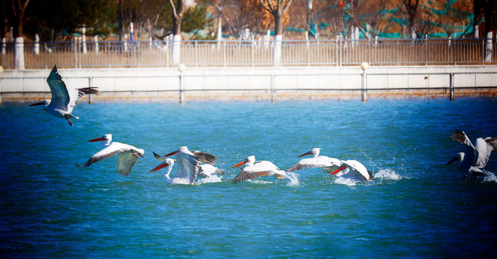 河北保定:世界濒危动物卷羽鹈鹕再次现身涞源湖