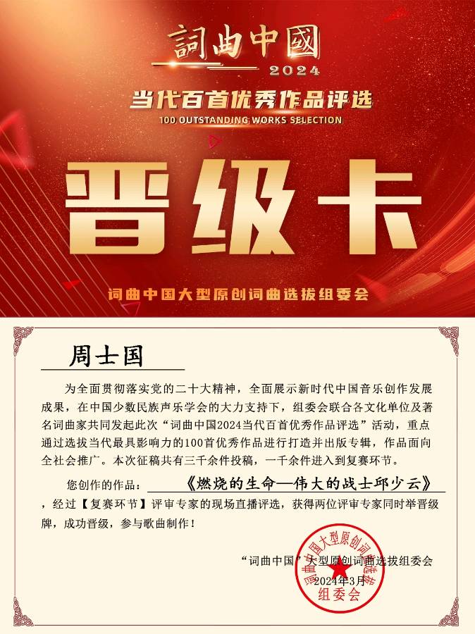 湖北企业文化网讯(记者姜家珍、大 州):为隆重中华人民共和国成立75周年,纪念伟大的国际主义战士、抗美援朝战斗英雄邱少云烈士牺牲72周年,弘扬伟大的爱国主义、革命英雄主义精神,积极投身社会主义现代化强国的建设之中,大力推进中华民族伟大复兴的现代化进程,由中国少数民族声乐协会、《词曲中国》组委会等单位共同举办的“词曲中国2024当代百首优秀音乐作品”评选活动,今年1月正式拉开帷幕;短短三个月时间,共收到来自海内外应征作品3000余首。经海选、复赛、复审等层层选拔,已有300多首原创音乐作品通过复审,获得参加全国总决赛的资格。定于今年6月在央视CCTV星光演播大厅,举行隆重的颁奖授牌仪式。