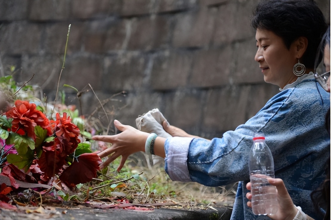 拾阶而上,采风团来到半山腰处的辛弃疾埋骨之地拜谒,在他的墓前献上鲜花,在坟头周边轻轻地撒上从济南带来的土和水。