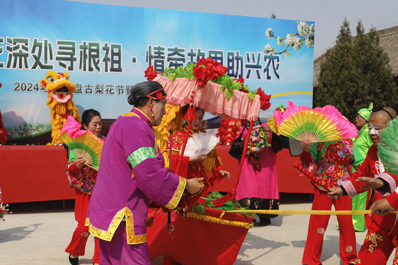 游客们不仅可以在梨园内徜徉花海,拍照打卡,还可以观看舞狮、武术、扭秧歌等精彩表演。此外,现场还设置民俗文化和非遗展区。其中,葫芦烙画、红木工艺品等精美非遗文创产品吸引游客驻足,让游客在欣赏美景的同时感受当地传统文化之美。