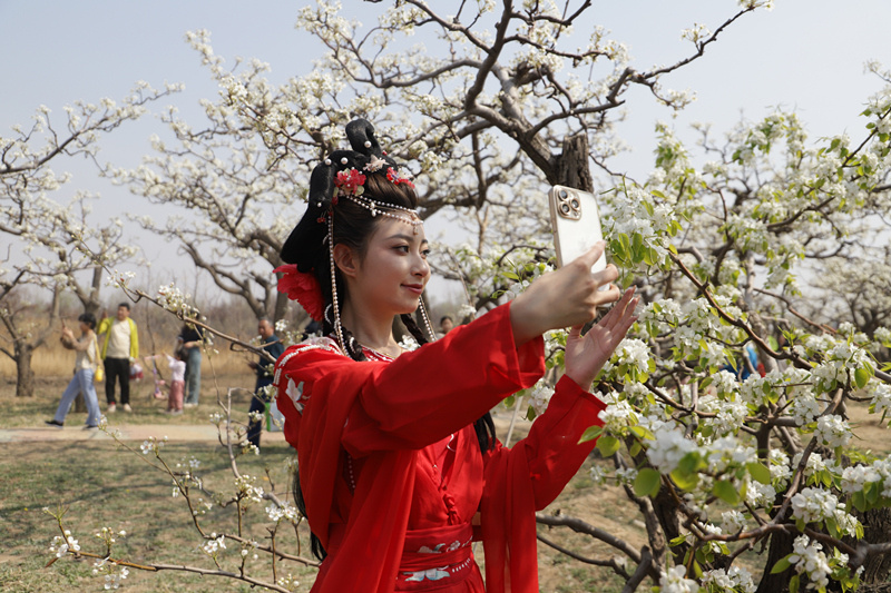 游客身着汉服在梨园内赏花拍照。 邢磊 摄