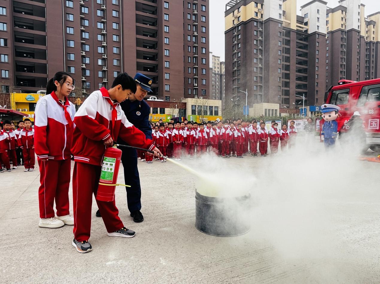 涞水县消防救援大队队员指导学生正确使用灭火器。李金璐 摄