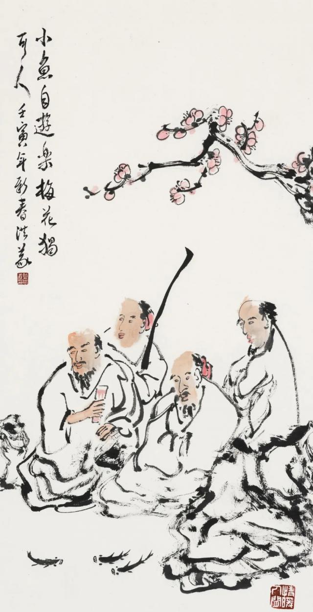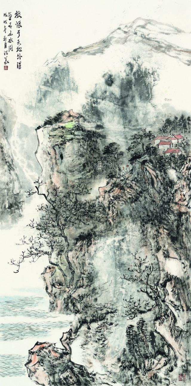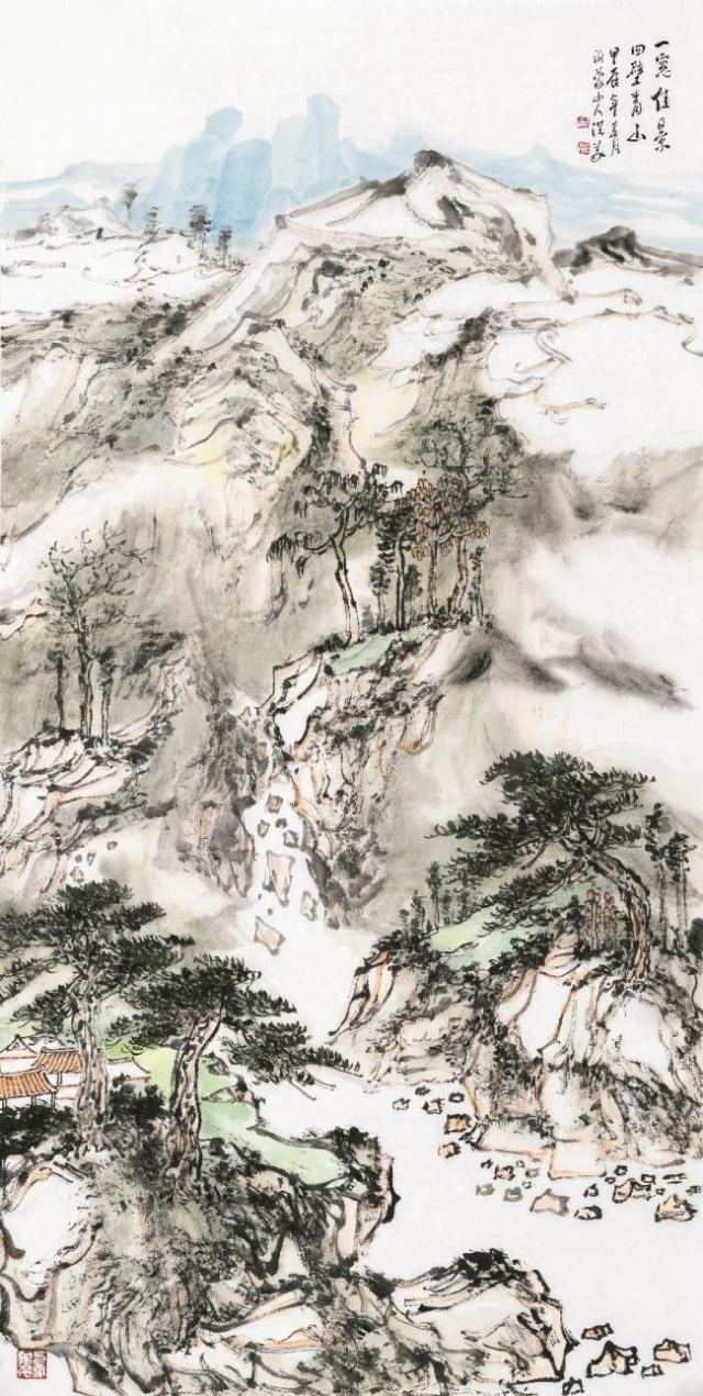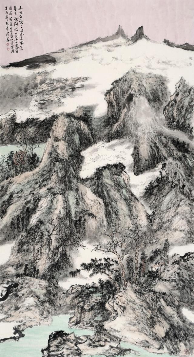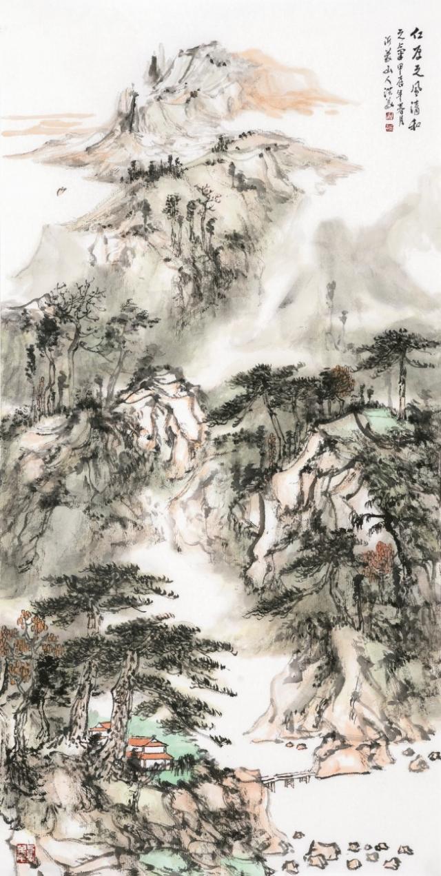盛洪义主要是画家,他的山水画得相当好,有文人画风,洪义的山水独树一格,在当代,特别是青年画家中是很杰出的。他不单纯画山水,人物、花鸟都能画,都有自己的风格。我是比较喜欢洪义的画,每当见到他的画,我总喜欢题上几个字。