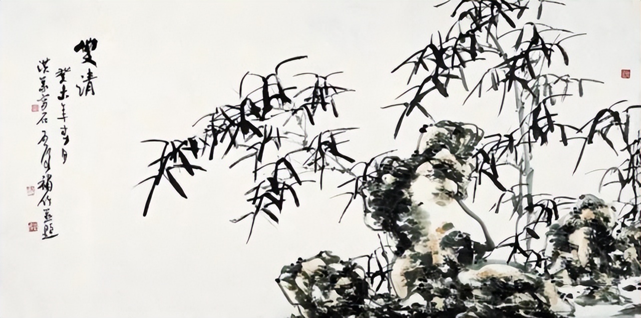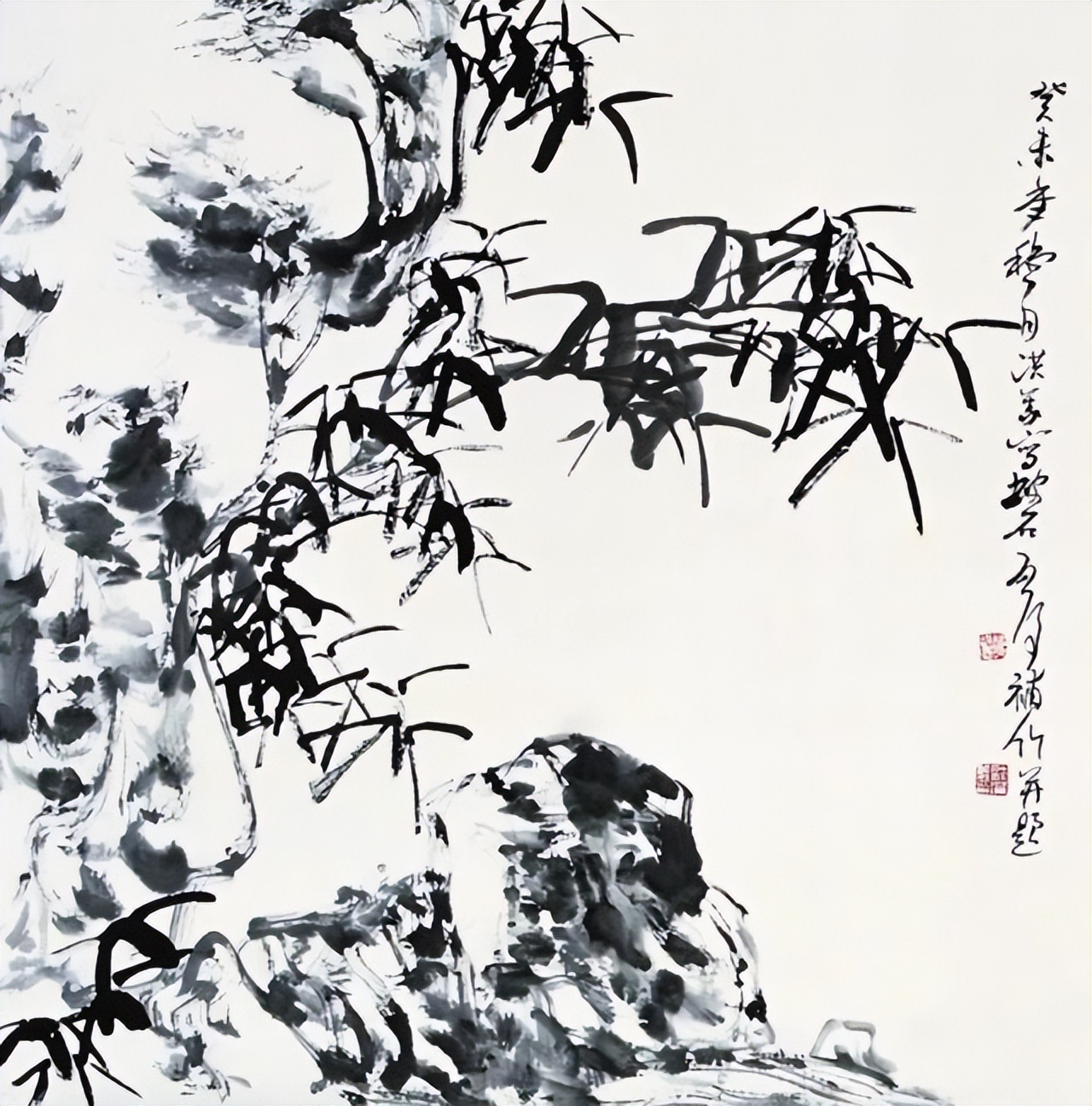 《双清》癸未年春月洪义写石启后补竹并题,68cm×136cm