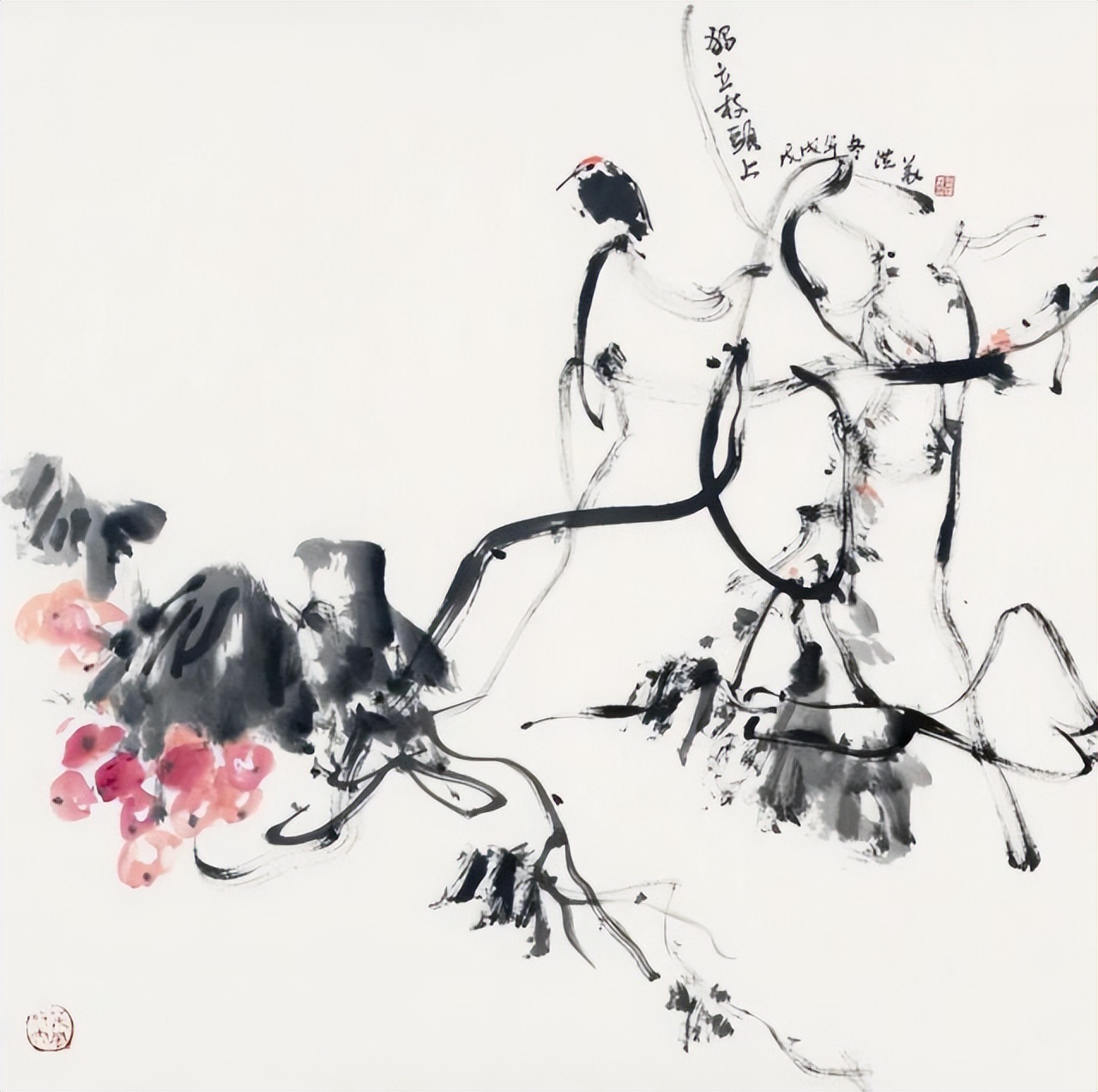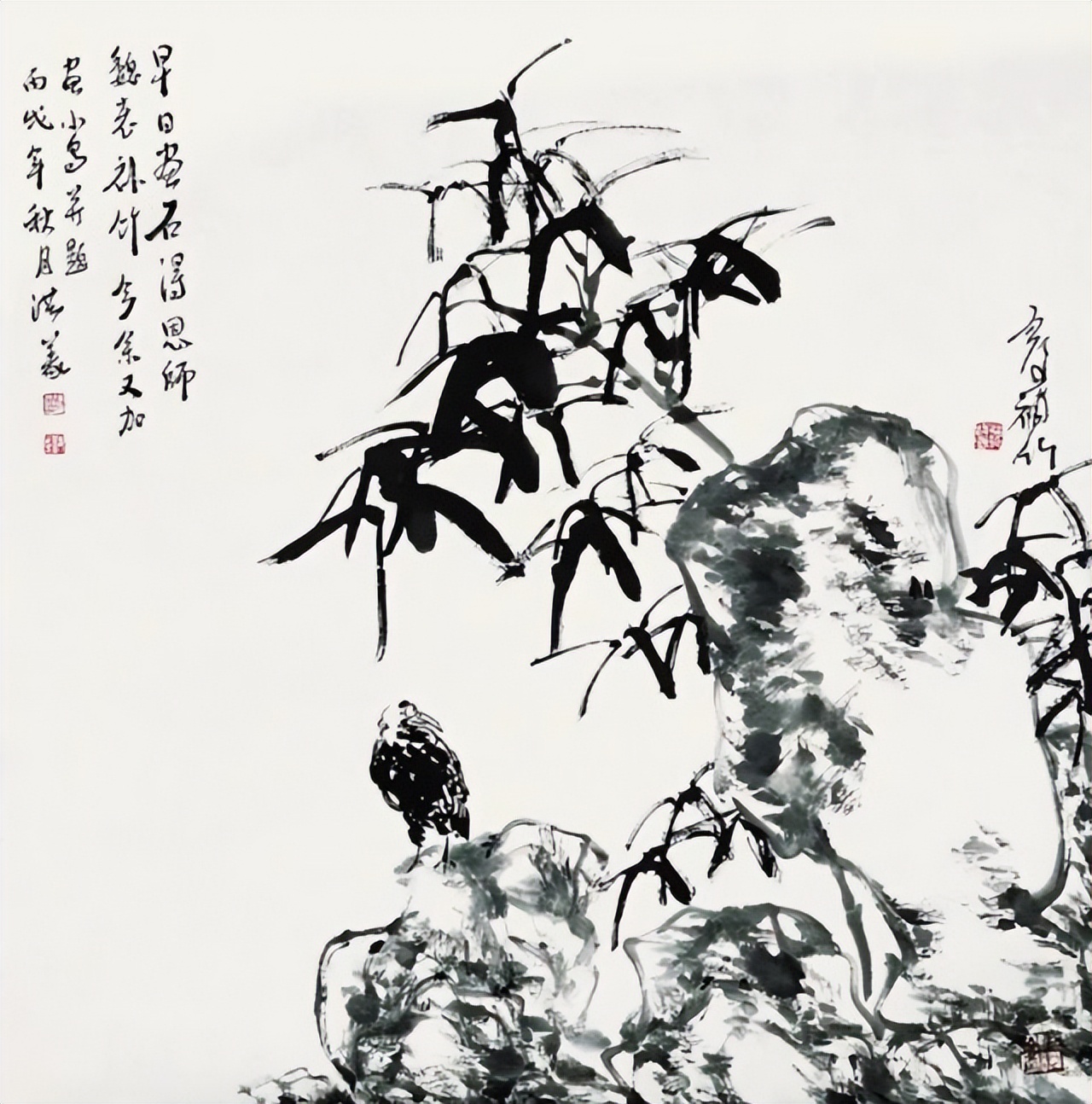 早日画石得恩师魏老补竹今余又加画小鸟并题,69cm×69cm