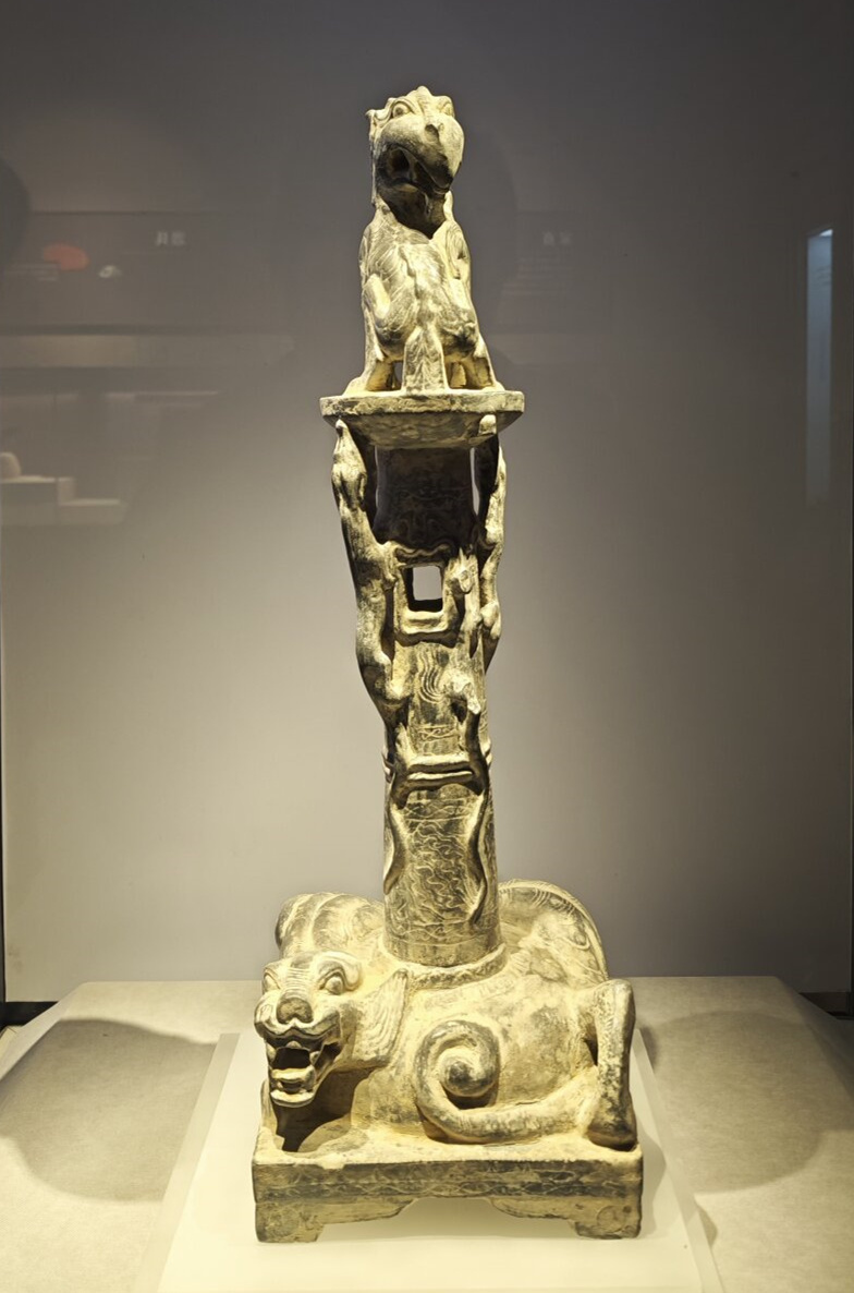 “作为汉代诸侯王的封地,冀州留存了丰富的文化遗产,这些文化遗产也成为冀州博物馆展陈的亮点。”夏钰引领记者来到“煌煌两汉”展区,两件黑石制成的文物引起了记者的注意。其中一件为造型精美的黑石熨斗架,通高63厘米,底部为正方形,浮雕一兽。其背部承托一圆柱状架体,上面浮雕四只昂首垂尾的虎形兽。熨斗架中间有个孔,是插熨斗柄用的。另一件为通高46.5厘米的黑石豆形器,豆盖上部有一对“亲密”的小鸟,豆柄上浮雕三只虎形兽,底座上浮雕一只俯卧状虎形兽,应是古代用来盛食物的器具。