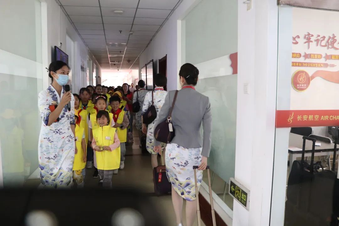 参观活动由长安航空有限责任公司女工委主任唐雨佳带领,唐主任也对本次的研学活动提出要求,强调了应遵循的事项。参观途中小天使们遇到了多位即将出发飞行的航空乘务员,大家都很开心。在飞行准备室门口,唐雨佳主任组织小天使们通过门口观看马上航飞的乘务人员做航飞前的工作安排场景。