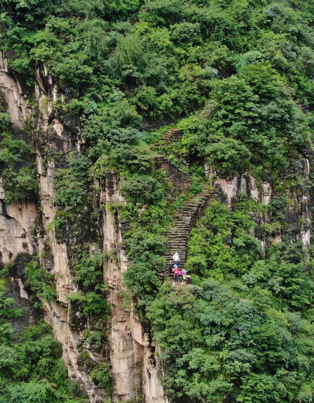 午餐后,穿行在绝壁之上的丛林之中,茂密的树林偶尔打开,瞬间感受到行在云端的感觉。看着悬崖绝壁上的下行小梯,不禁感慨,如此绝壁上竟有这样一条小路,妙哉妙哉!之后抵达【八里沟景区】,入住景区内宾馆。