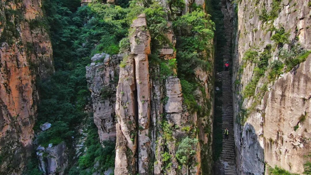 早餐后,我们前往徒步入口。远远望去,铁壁铜墙般的太行山被嵌入一个U型豁口,这便是鲁班见村民被大山阻隔,出行不便,抡斧劈山而成的“鲁班豁”。传说归传说,但此豁口确是古时豫晋两省来往的主要通道之一。行走在数百年的古道之上,凉风习习,浮云变换,如入仙境,鲁班梯的惊险绝伦让人惊叹不已。