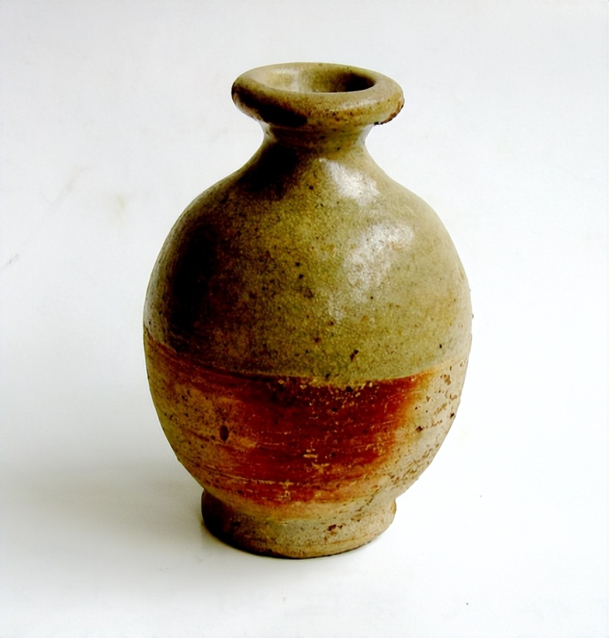 青釉盘口瓷酒瓶,鼓腹饼底短脖颈。