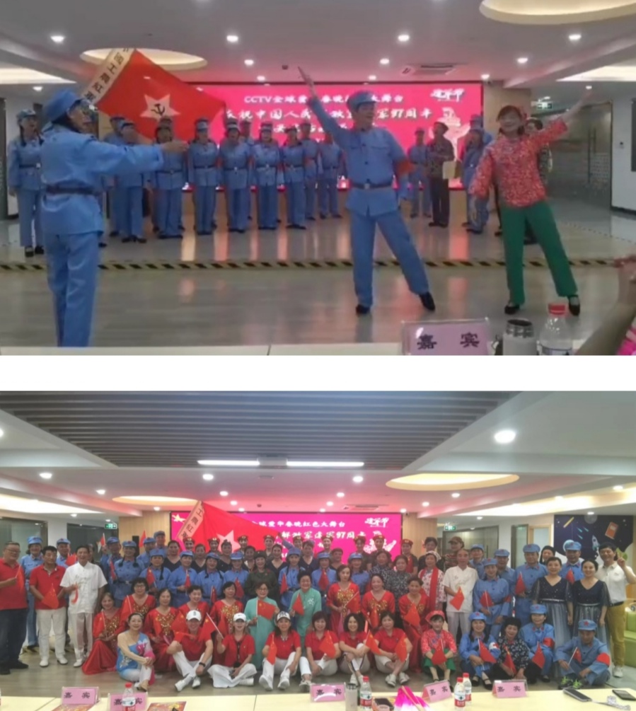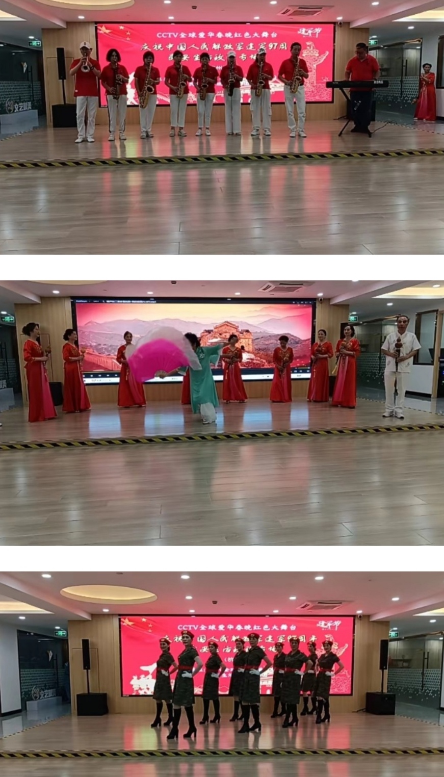 前导队英姿飒爽首先上场,接着主持人孙琪辉女士、翟广明先生致开幕词并邀请CCTV全球爱华春晚杭州站执行主席刘远飞女士发表重要讲话,然后上演丰富多彩的文艺节目。有萨克斯合奏《中国人民解放军进行曲》、《打靶归来》、《电影插曲联奏》,葫芦丝二重奏歌弦舞《我的祖国》,时装走秀《军中绿花》、《女兵》,有女声独唱《绿色军衣》,女声小组唱《毛主席的话儿记心上》,独舞《生命的河》,还有情景合唱《十送红军》等节目,内容丰富形式多样 。