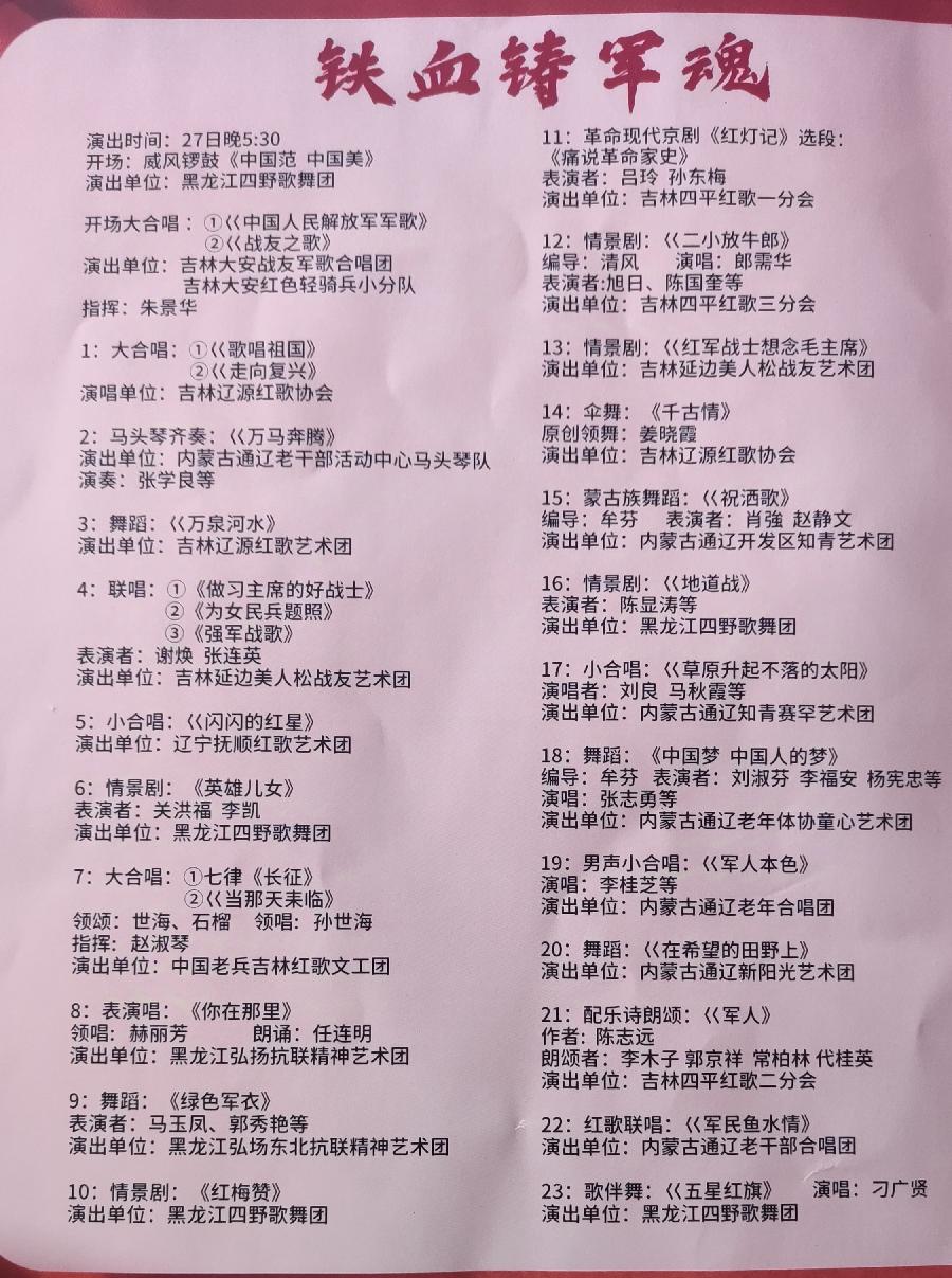 两场演出了45个节目,有锣鼓、民乐合奏、联唱、大合唱、舞蹈、情景剧、京剧、配乐诗朗诵等丰富多彩的节目,最后在大合唱《没有共产党就没有新中国》歌声中圆满落幕。