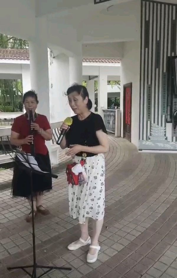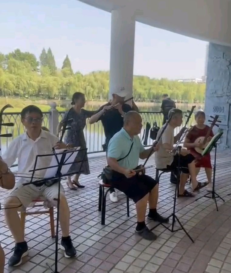 水榭亭台四美塘,琴音韵味醉心房。晨怡亮嗓精神爽,调雅高歌艺苑芳。