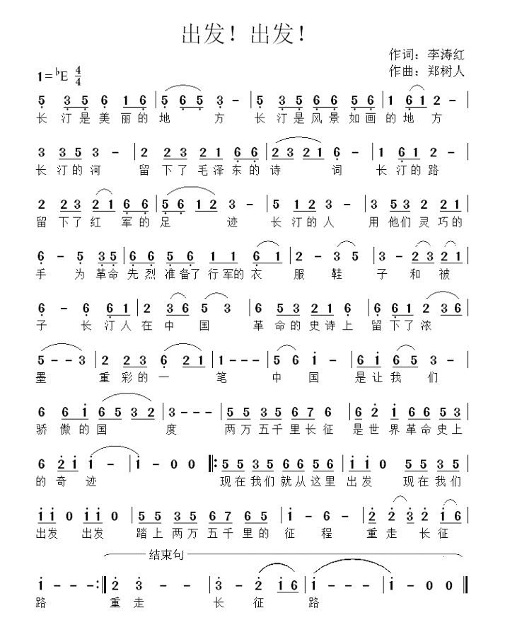 ●作曲:郑树人 歌词《出发!出发!》 ●词:李涛红 长汀是美丽的地方 长汀是风景如画的地方 长汀的河留下了毛泽东的诗词 长汀的路留下了红军的足迹 长汀的人用他们灵巧的手为革命先烈 准备了行军的衣服 鞋子和被子 长汀人在中国革命的史诗上 留下了浓墨 重彩的一笔 中国是让我们骄傲的国度 两万五千里 长征是世界革命史上的奇迹 现在我们就从这里出发 现在我们出发出发 踏上两万五千里的征程 重走长征路 现在我们就从这里出发 现在我们出发出发 踏上两万五千里的征程 重走长征路 重走长征路