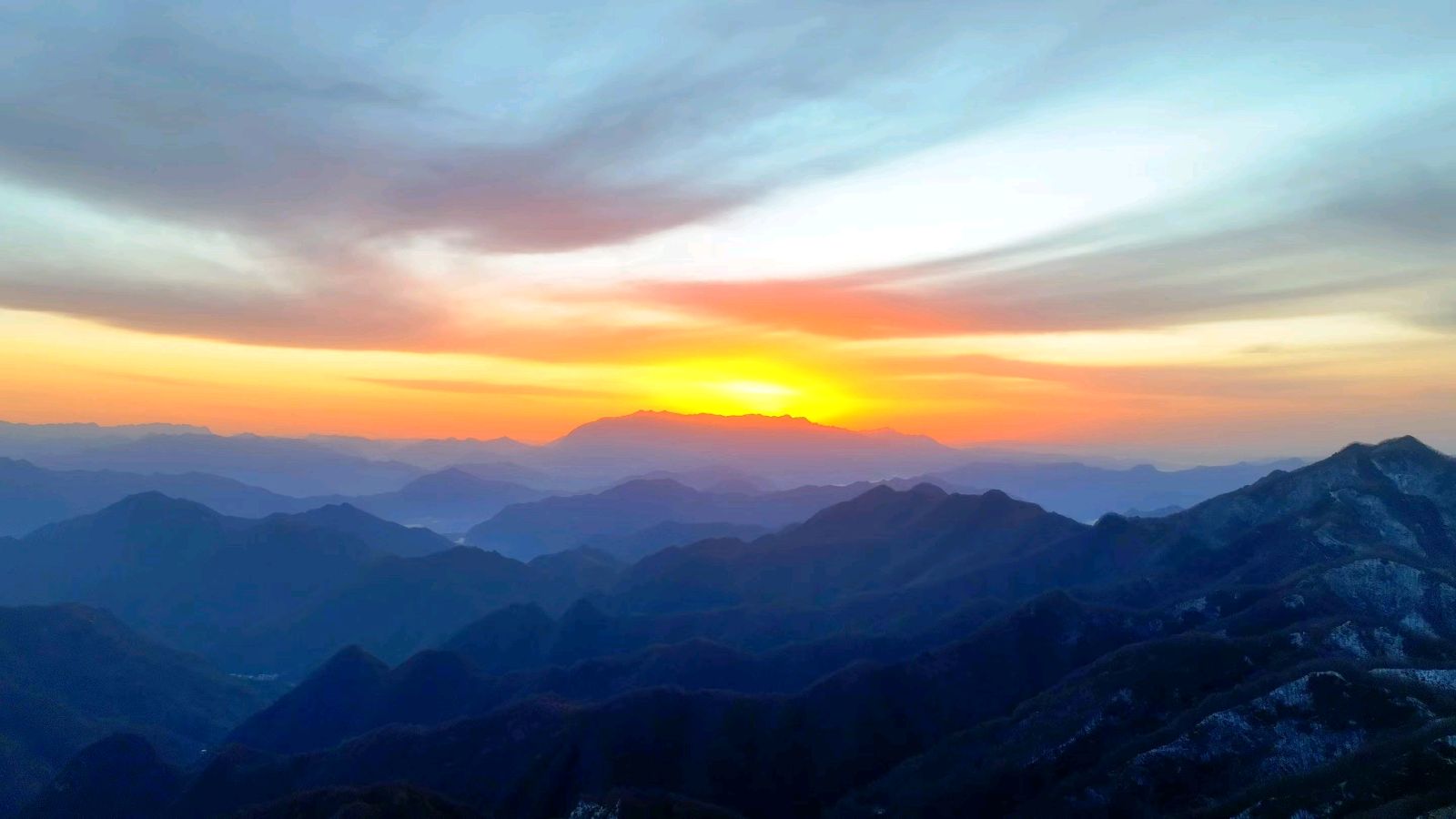 霜摧大地红霞断,雪覆山川白雾连。
