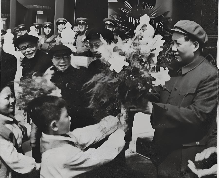 1954年5月1日,王光如和刘春延代表全国少先队员登上天安门城楼,把鲜花献给毛主席。