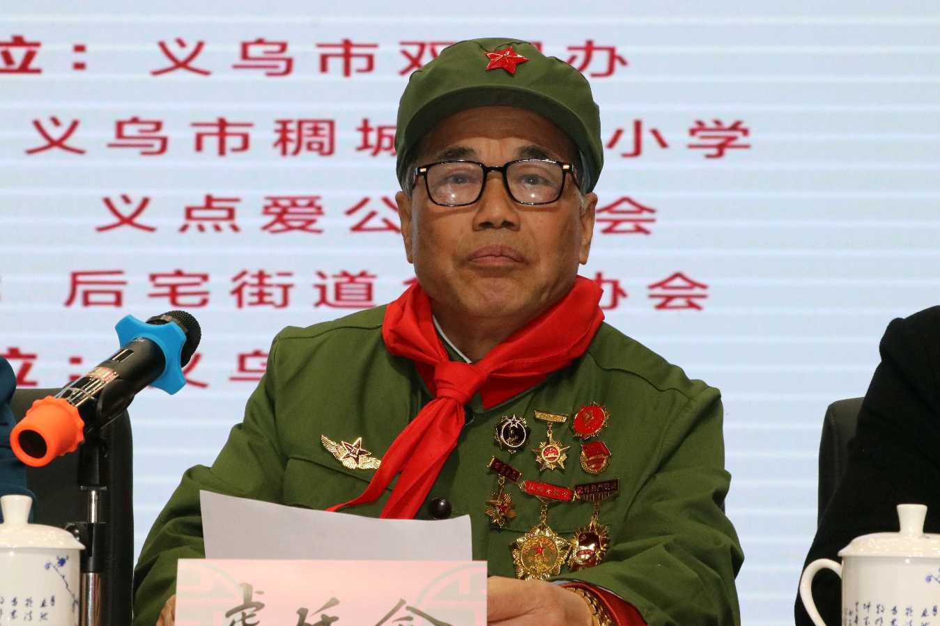 莅临现场的有,义乌市军队离休退休干部休养所办公室主任何凌,副校长张静,大队辅导员黄老师,荣获“全国军民共建人口和计划生育工作先进个人”荣誉称号及三等功的副师级退休干部曹巧萍阿姨,中国人民解放军一等功臣楼建平,义乌老兵、老党员虞廷金,自卫反击战英雄、受嘉奖5次的义乌老兵王银升,“义点爱”公益协会的创始人、会长、最美拥军人物、金华市最美志愿者方荣森等。